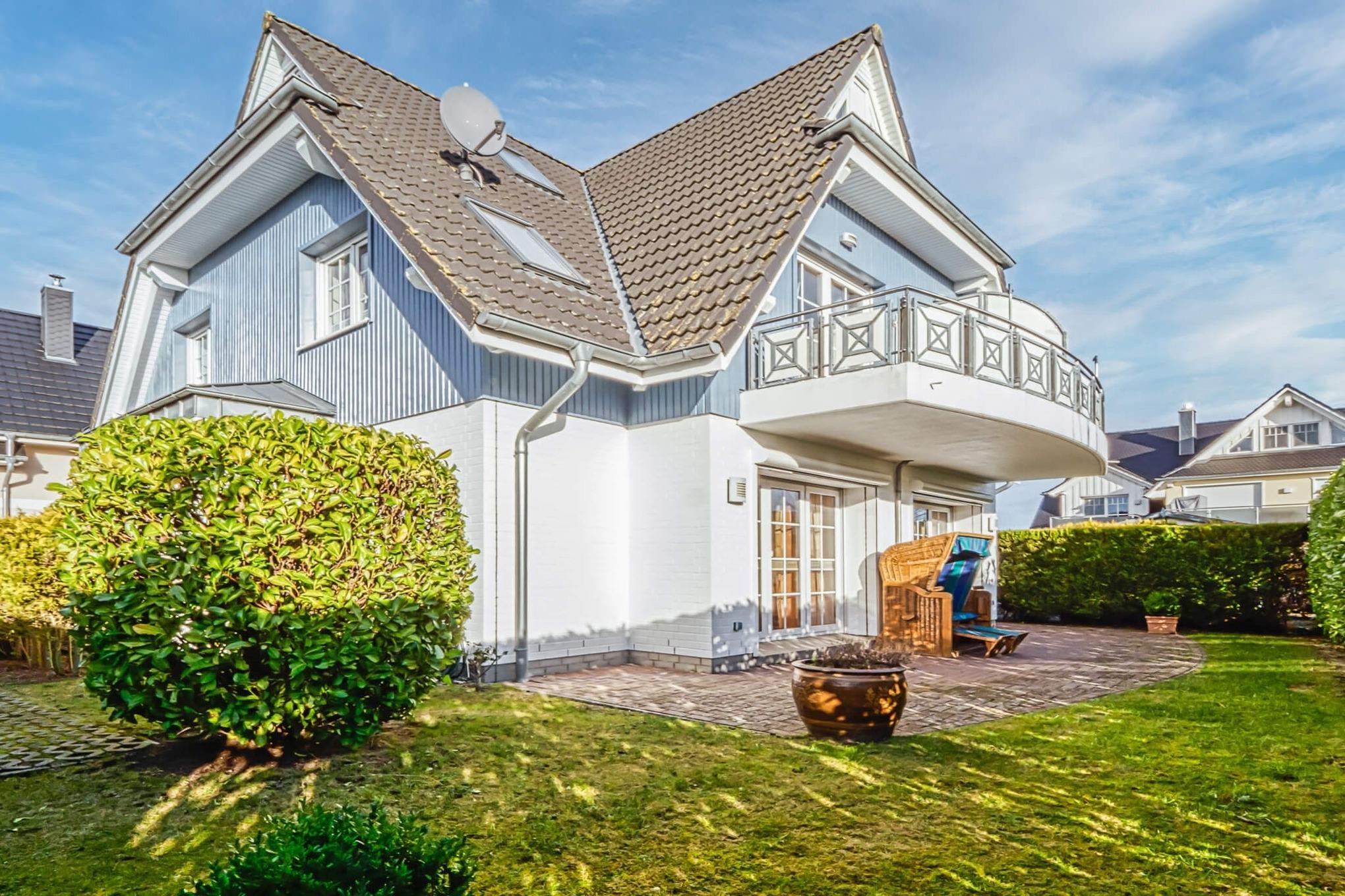Auf der Terrasse laden Gartenmobiliar sowie ein Strandkorb zum Verweilen ein.