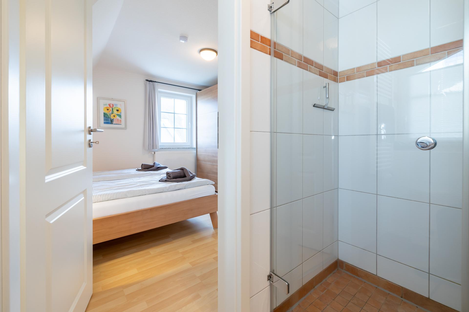 Im Oberen Bereich des Hauses befinden sich die Schlafzimmer, im 1 OG Schlafzimmer mit Doppelbett und Zugang zum Badezimmer mit Dusche und WC.
