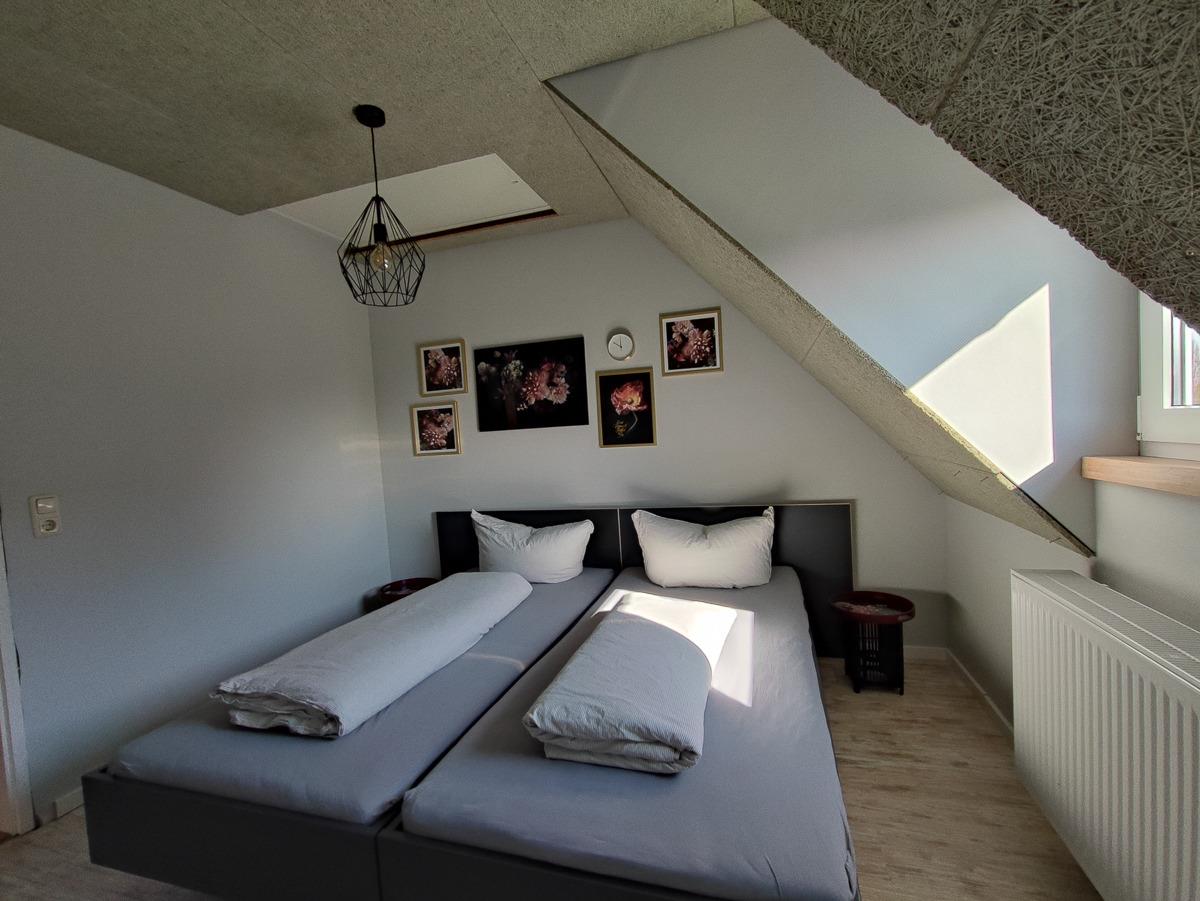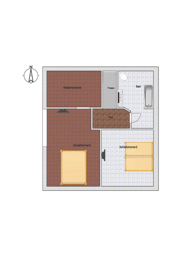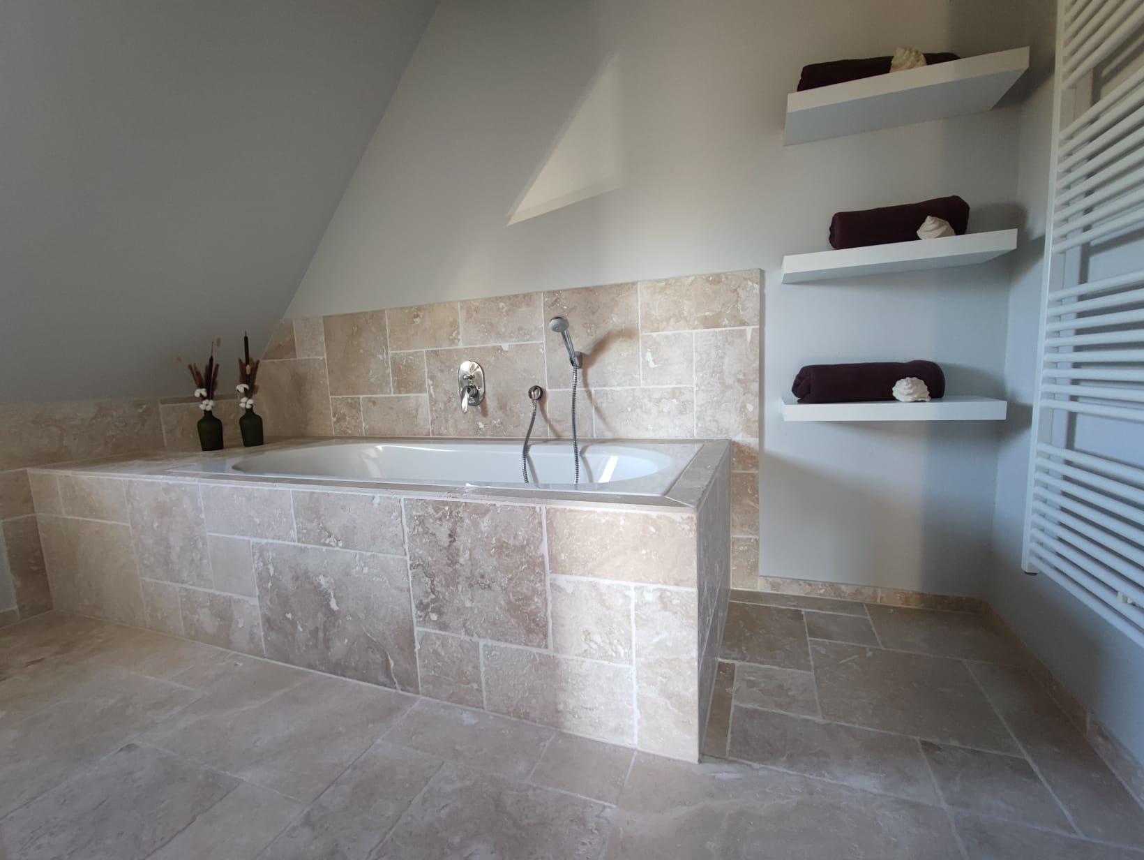 Das 2. Schlafzimmer ist mit 2 zusammengestellten Einzelbetten, Nachttischen und Kommode und einem Flachbildschirm mit Satellitenanschluss ausgestattet. Im OG befindet sich das große Badezimmer mit Badewanne.