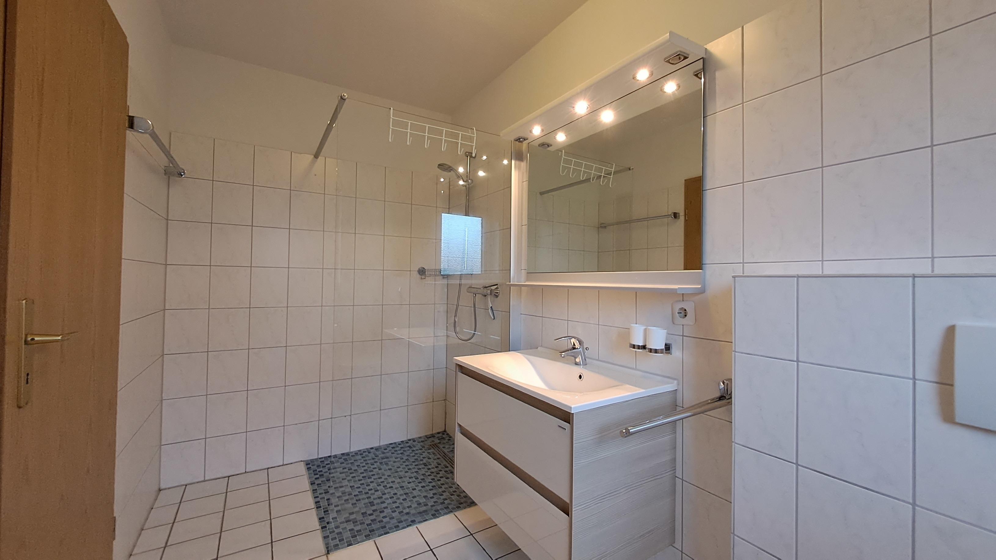 - Bodentiefe Dusche mit Glaswand sowie Waschtisch mit Spiegelschrank