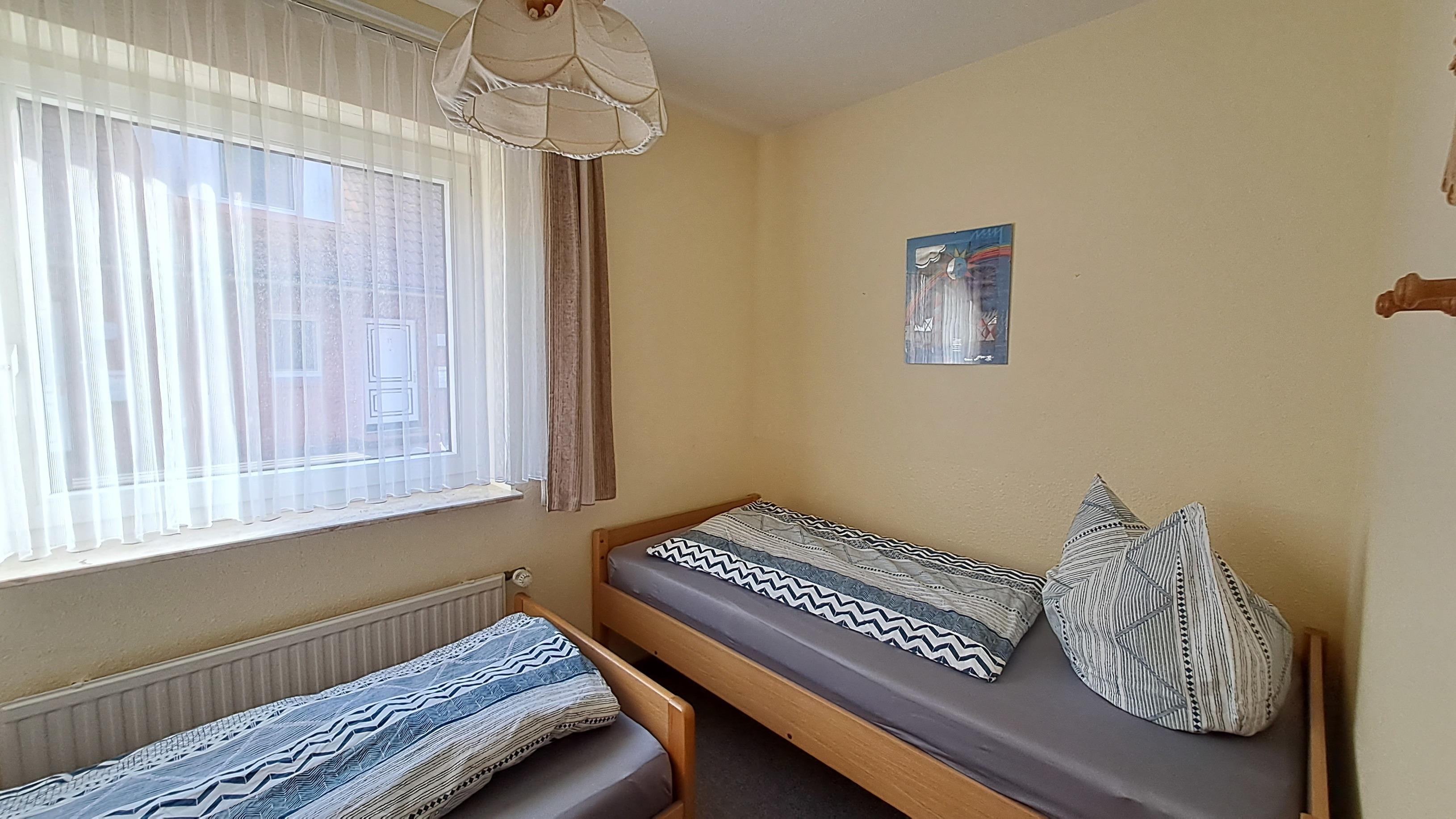- Zwei Einzelbetten (90x200 cm), kleiner Kleiderschrank und Rollläden