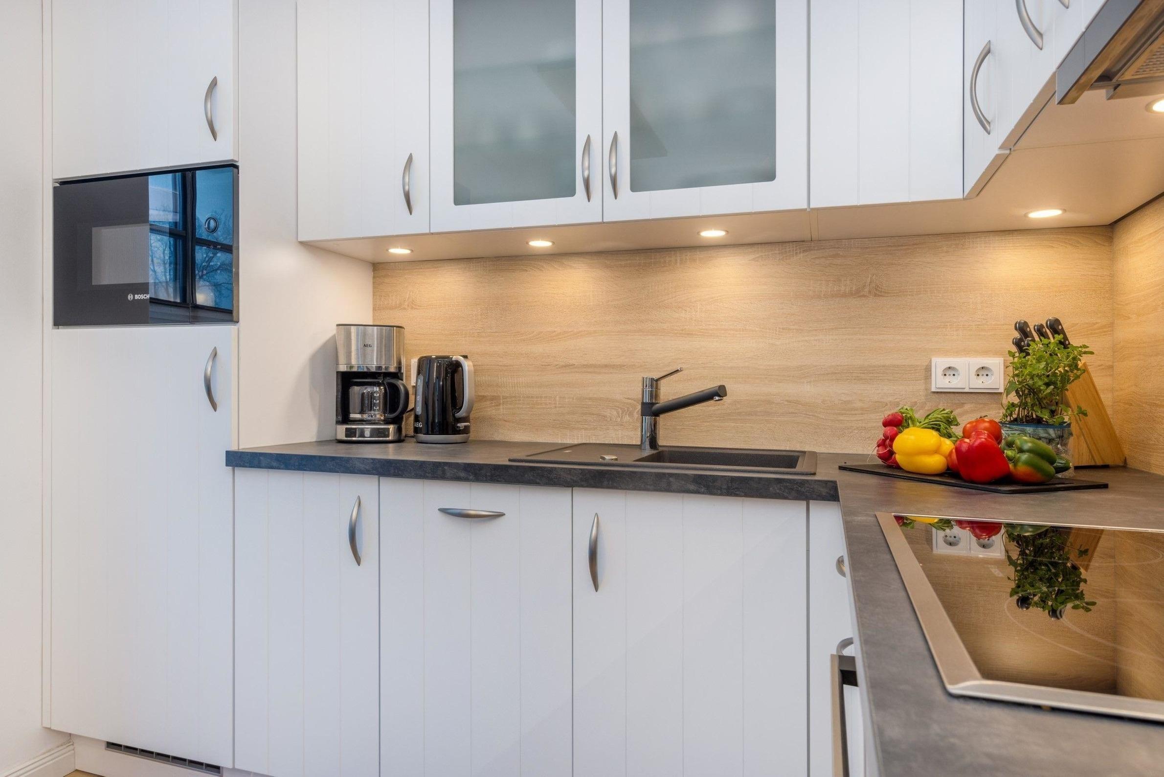 Die Ferienwohnung bietet eine stilvolle und komfortable Unterkunft mit einem durchdachten Raumkonzept. Sie verfügt über zwei Schlafzimmer, in denen ein Doppelbett und zwei Einzelbetten Platz finden. Das Badezimmer ist mit einer bodengleichen Dusche ausgestattet und besticht durch ein Fenster, einen Kosmetikspiegel sowie einen Haartrockner. Die offene Küche ist ein Highlight der Wohnung und bietet moderne Annehmlichkeiten wie einen Geschirrspüler, einen Elektro-/Gasherd, einen Backofen, eine Mikrowelle und zahlreiche Kleingeräte wie einen Toaster und eine Kaffeemaschine. Ein Esstisch lädt zu gemeinsamen Mahlzeiten ein. Die technische Ausstattung umfasst WLAN, einen TV und eine HiFi-Anlage. Für zusätzlichen Komfort sorgt der Kamin/Kachelofen. Praktische Extras wie eine Waschmaschine, ein Bügeleisen sowie ein Erste-Hilfe-Set sind ebenfalls vorhanden. Die Wohnung ist allergikergeeignet und bietet einen Parkplatz. Brettspiele und Fliegengitter sorgen für zusätzlichen Wohnkomfort.