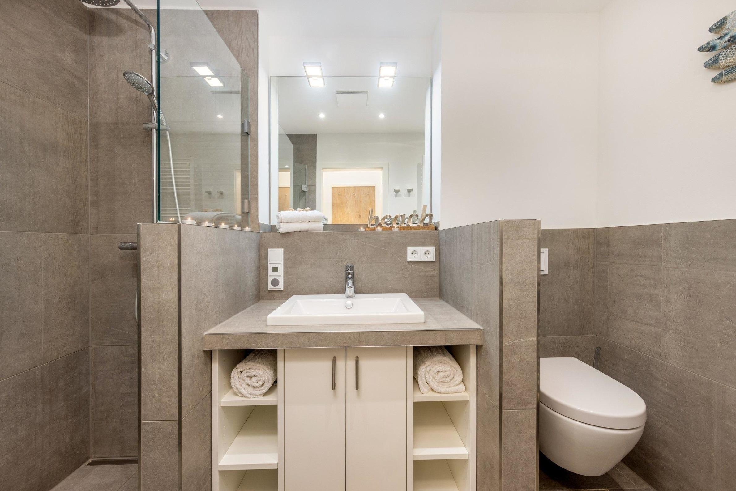 Die Ferienwohnung bietet eine moderne und allergikergeeignete Ausstattung für erholsame Tage. Mit zwei einladenden Schlafzimmern, die jeweils mit einem Doppelbett ausgestattet sind, sorgt sie für komfortablen Schlaf. Die offene Küche ist perfekt für Hobbyköche und verfügt über alles Notwendige, darunter einen Geschirrspüler, Elektro-/Gasherd, Backofen und Kühlschrank. Eine Mikrowelle, Kaffeemaschine und Toaster sind ebenfalls vorhanden. Das lichtdurchflutete Badezimmer wartet mit einer bodengleichen Dusche, einem Kosmetikspiegel und einem ersten Hilfe-Set auf. Der Wohnbereich besticht durch einen Kamin oder Kachelofen und ist mit einer HiFi-Anlage und TV ausgestattet. Für die Freizeit stehen Brettspiele bereit. Die Wohnung verfügt zudem über WLAN, einen Parkplatz, eine Waschmaschine und einen Wäscheständer. Fliegengitter, Rauchmelder und Feuerlöscher sorgen für Sicherheit und Komfort. Ein Garten mit Sonnenschirm lädt zum Entspannen im Freien ein.