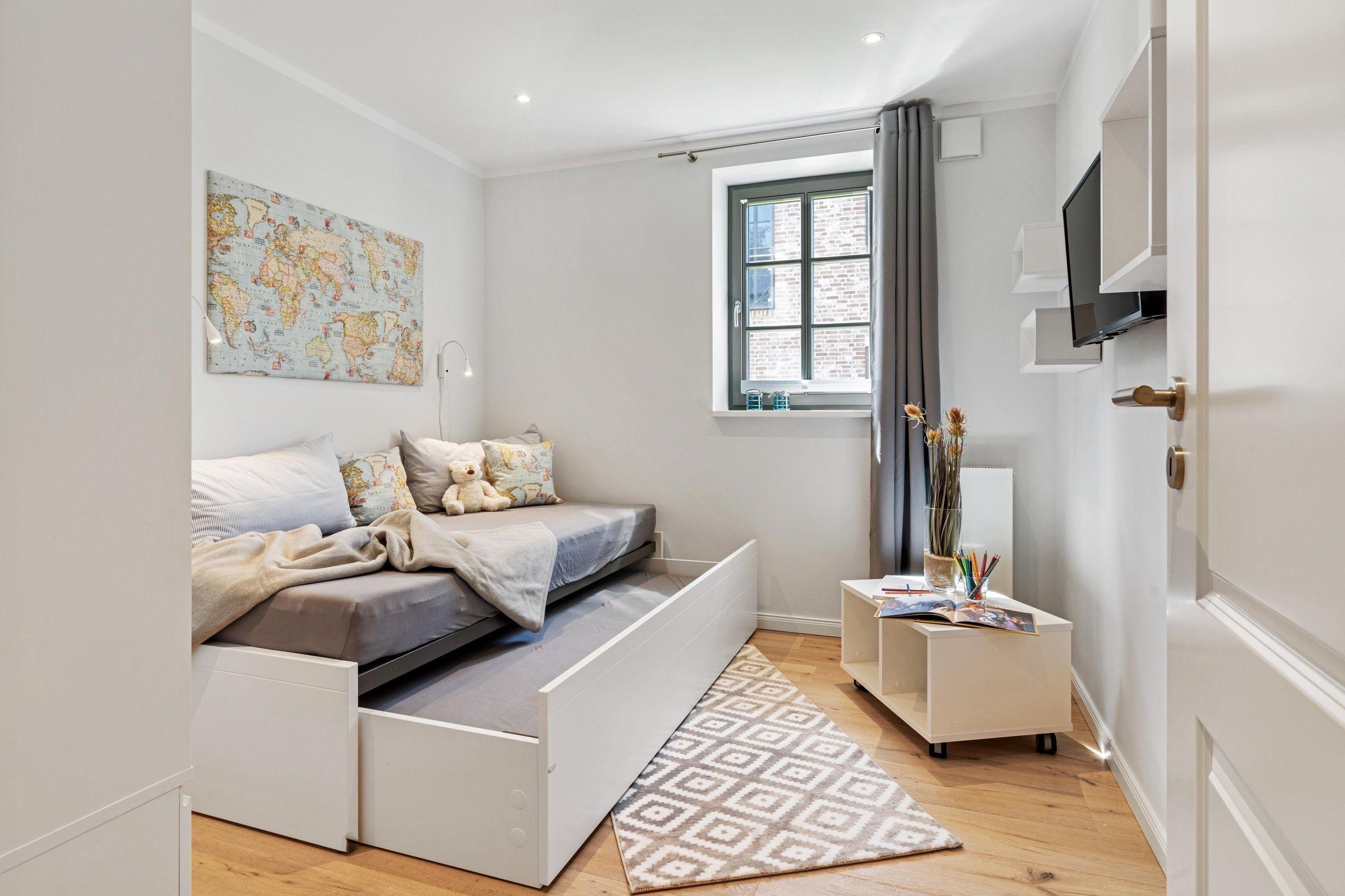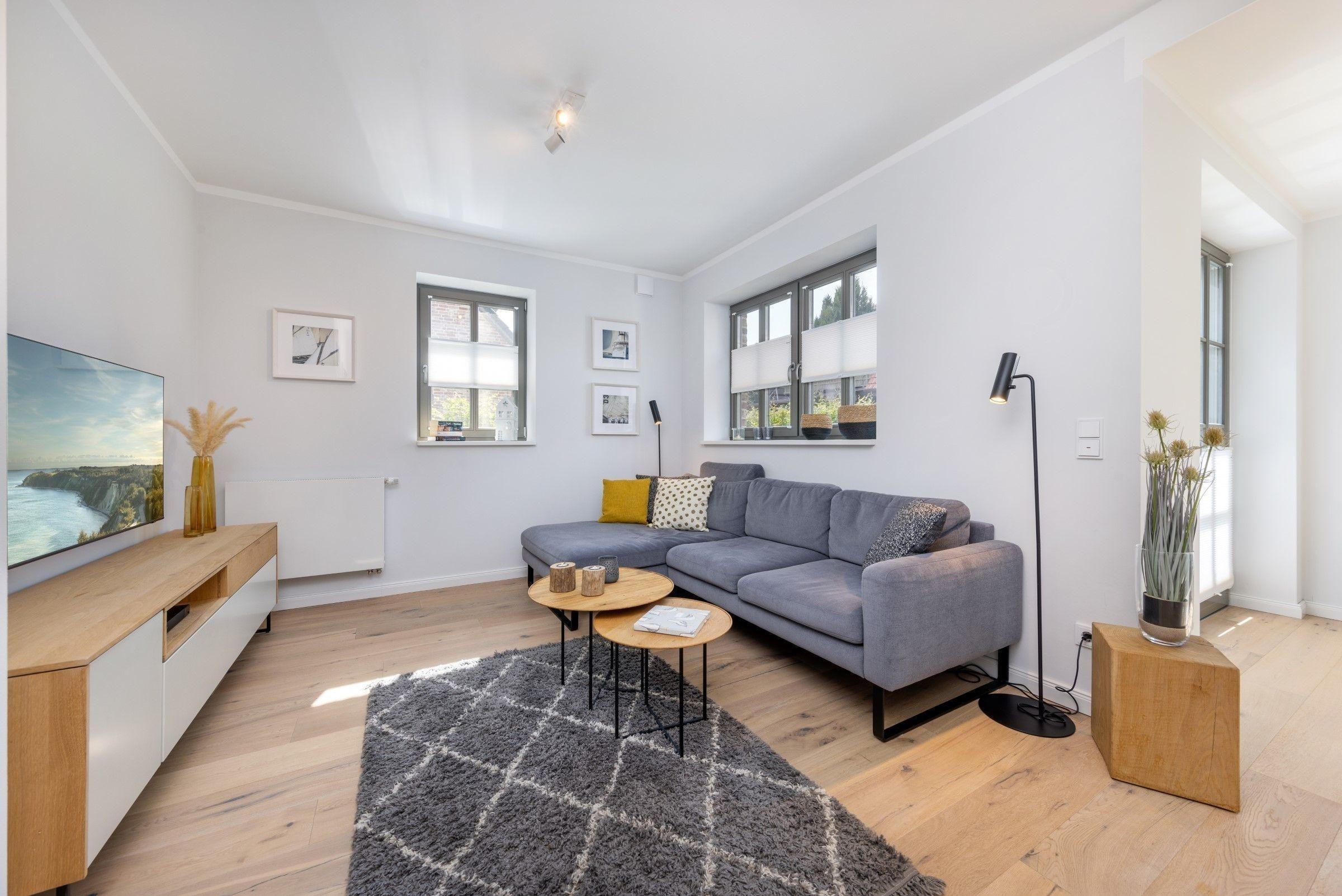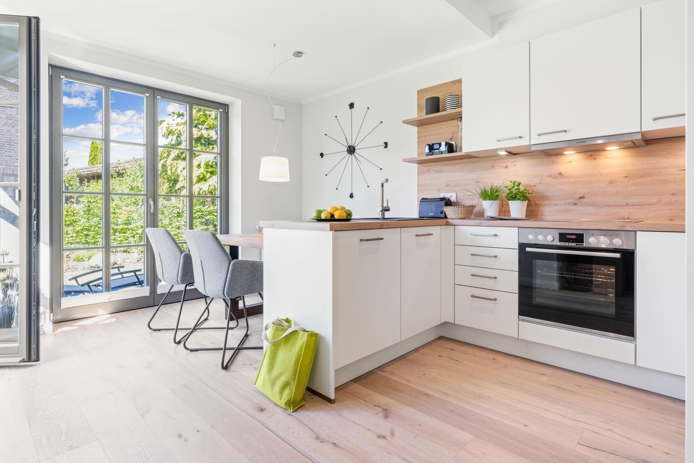 Die Ferienwohnung zeichnet sich durch eine moderne und großzügige Raumgestaltung aus, die sowohl Komfort als auch Funktionalität bietet. In der offenen Küche findet sich eine umfassende Ausstattung, darunter Geschirrspüler, Elektro-/Gasherd, Backofen, Mikrowelle, Kühlschrank sowie eine Kaffeemaschine. Die beiden Schlafzimmer verfügen über ein Doppelbett und zwei Einzelbetten, die für einen erholsamen Schlaf sorgen. Das Badezimmer ist mit einer bodengleichen Dusche und einem Haartrockner ausgestattet.