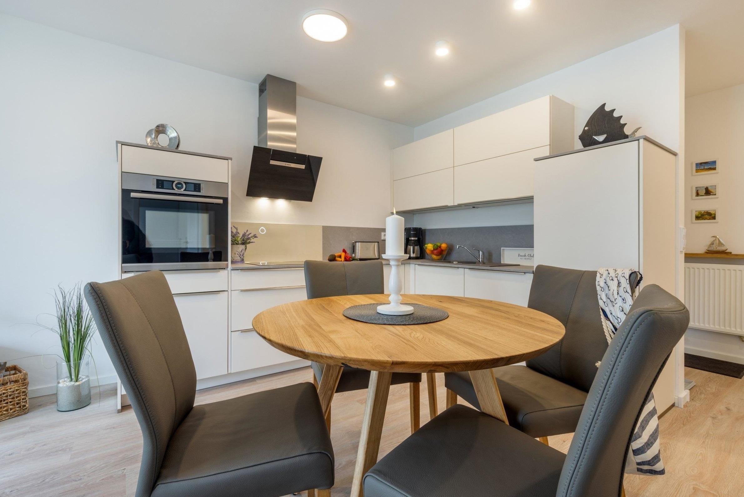 Die Ferienwohnung bietet eine komfortable und allergikerfreundliche Unterkunft für entspannte Urlaubstage. Der großzügige Wohn- und Schlafbereich mit einem Doppelbett und einer Schlafcouch lädt zum Verweilen ein. Die offene Küche ist mit modernen Geräten ausgestattet, darunter Geschirrspüler, Elektro- und Gasherd, Backofen, Mikrowelle, Kühlschrank, Kaffeemaschine, Toaster und Mixer. Das Badezimmer verfügt über eine bodengleiche Dusche, einen Haartrockner sowie einen Kosmetikspiegel. Entspannung finden Gäste auch in den gemütlichen Sesseln oder am Esstisch, während eine HiFi-Anlage und ein TV für Unterhaltung sorgen. Praktische Annehmlichkeiten wie WLAN, Waschmaschine, Wäschetrockner sowie ein Wäscheständer und ein Bügeleisen sind ebenfalls vorhanden. Sicherheit wird durch Rauchmelder und ein Erste-Hilfe-Set gewährleistet. Außenausstattungen wie ein Sonnenschirm und Brettspiele machen den Aufenthalt perfekt.