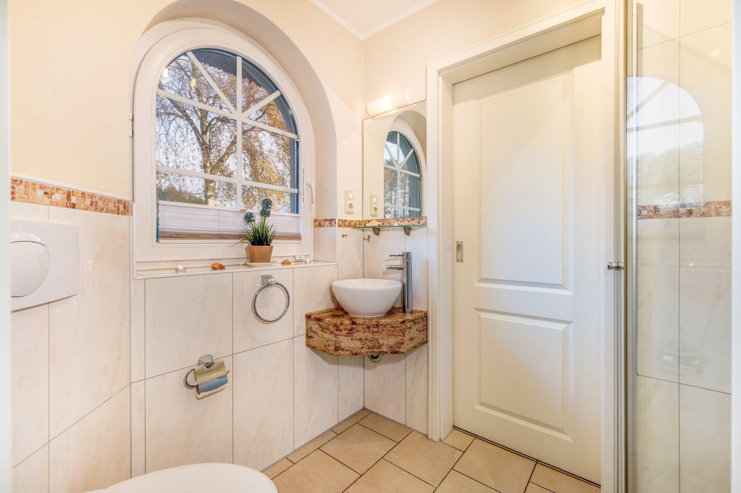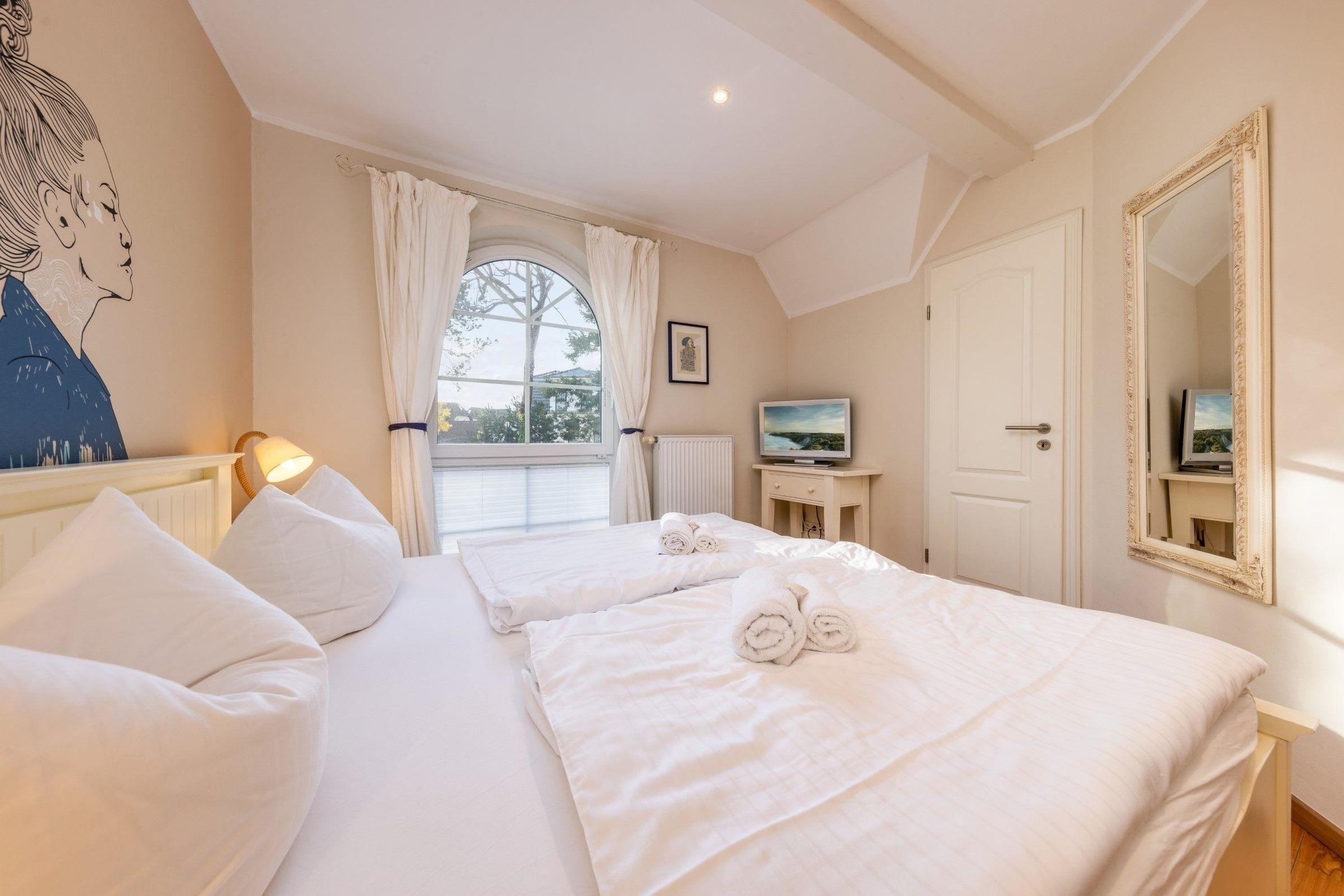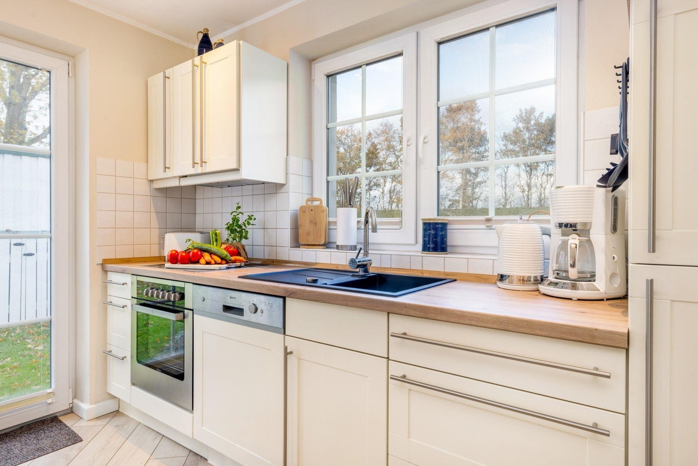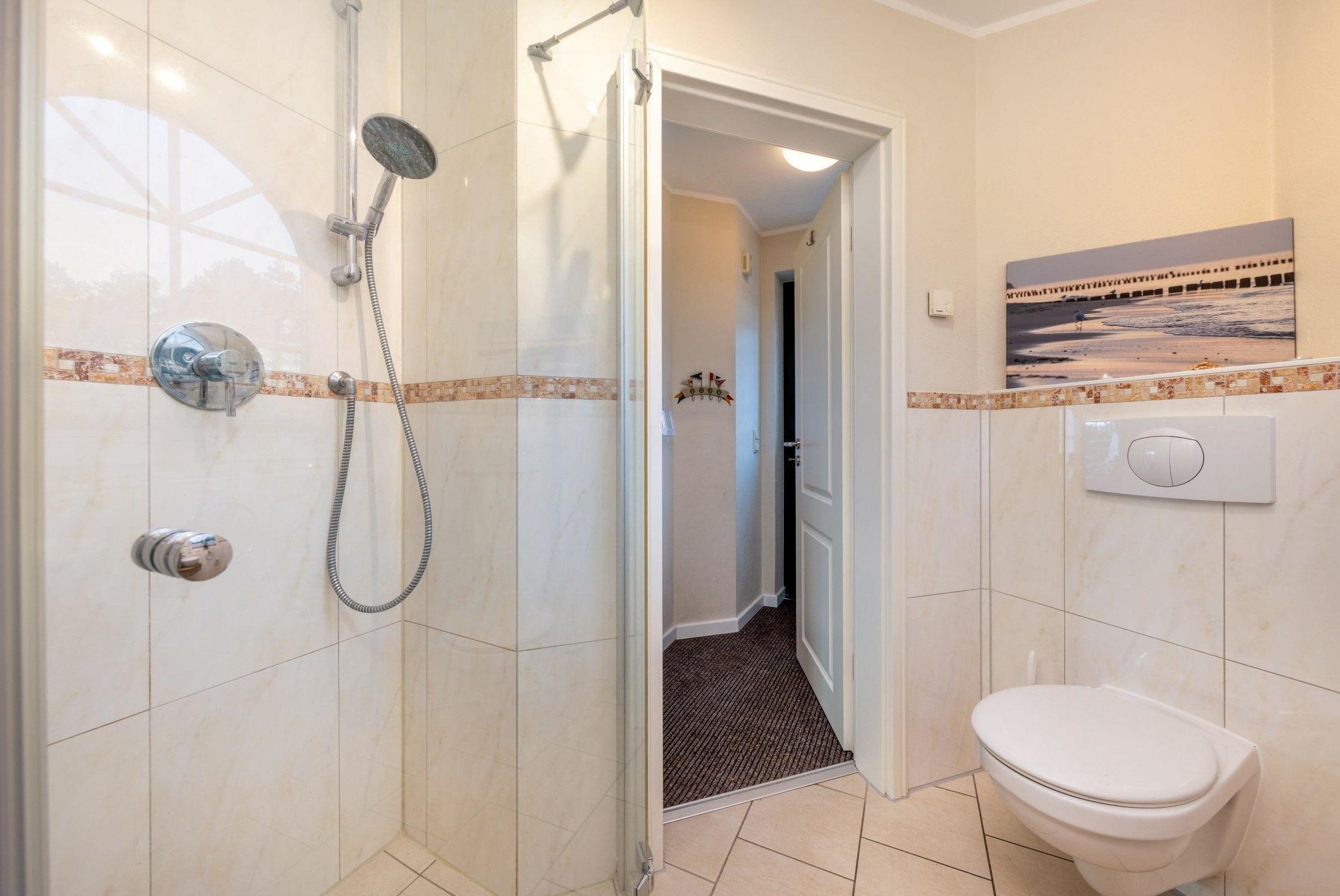 Die Ferienwohnung bietet einen komfortablen Rückzugsort mit drei durchdacht gestalteten Schlafzimmern, darunter zwei Doppelbetten und ein Einzelbett. Die offene Küche ist vollständig ausgestattet mit modernen Geräten, einschließlich Geschirrspüler, Elektro-/Gasherd, Backofen, Mikrowelle und Kühlschrank. Der Essbereich mit Esstisch und ausreichend Geschirr sowie Besteck lädt zu gemeinsamen Mahlzeiten ein. Zwei Badezimmer, eines davon mit bodengleicher Dusche, gewährleisten Komfort für alle Gäste.