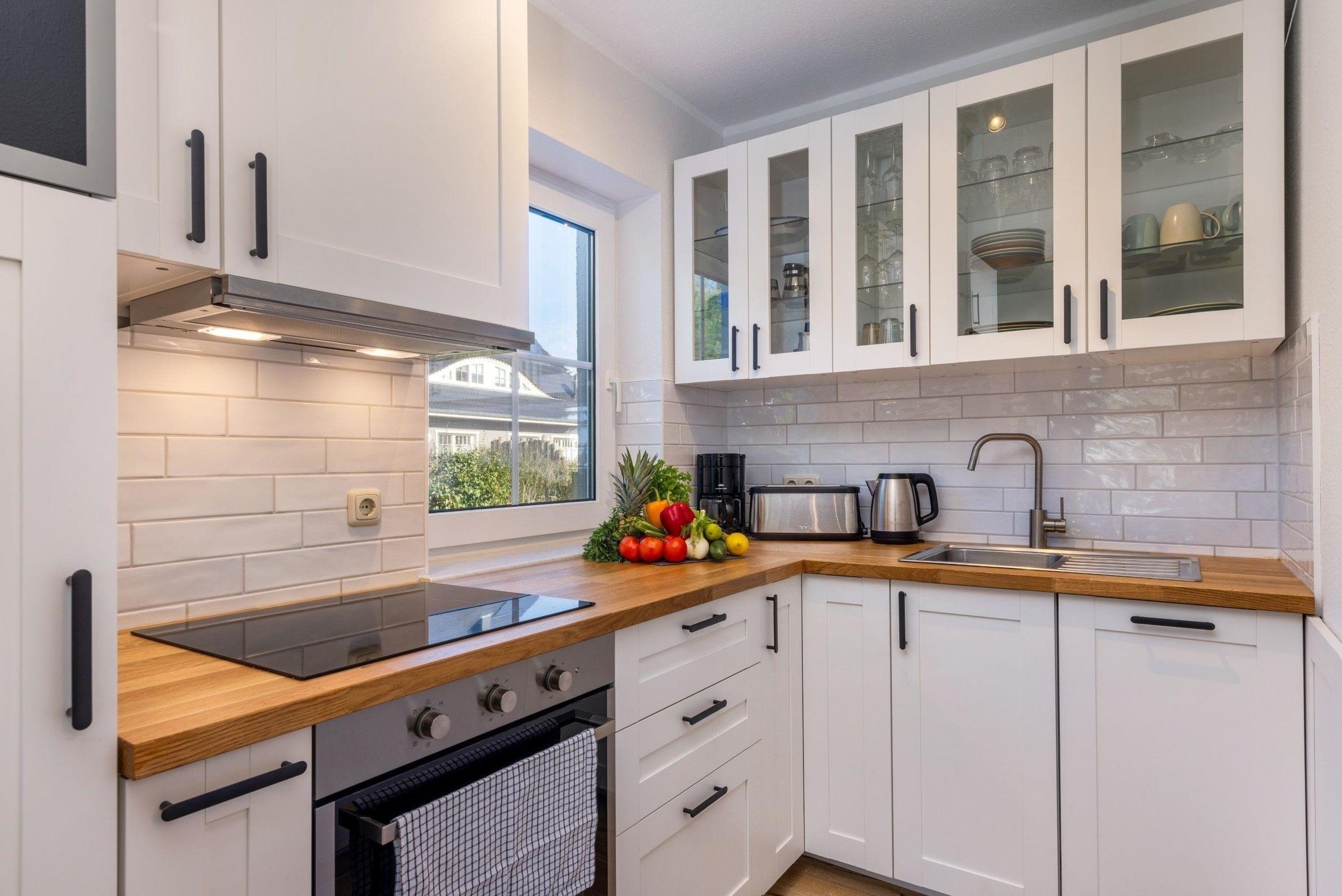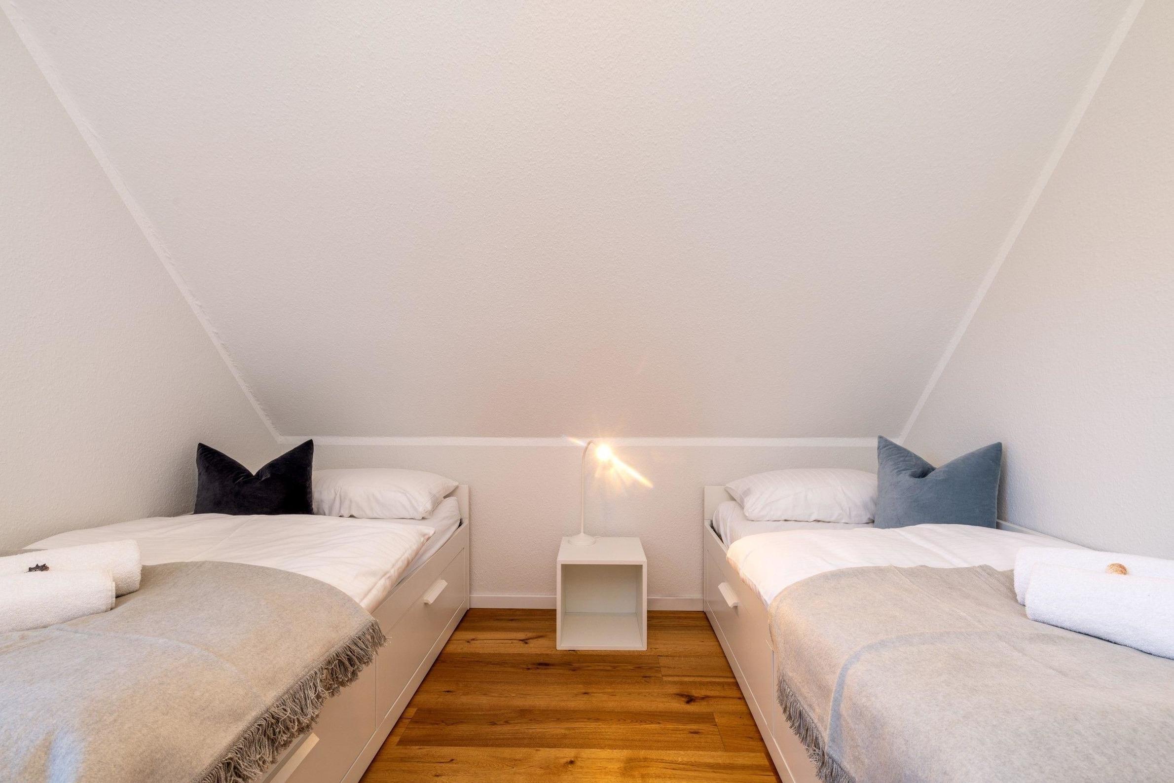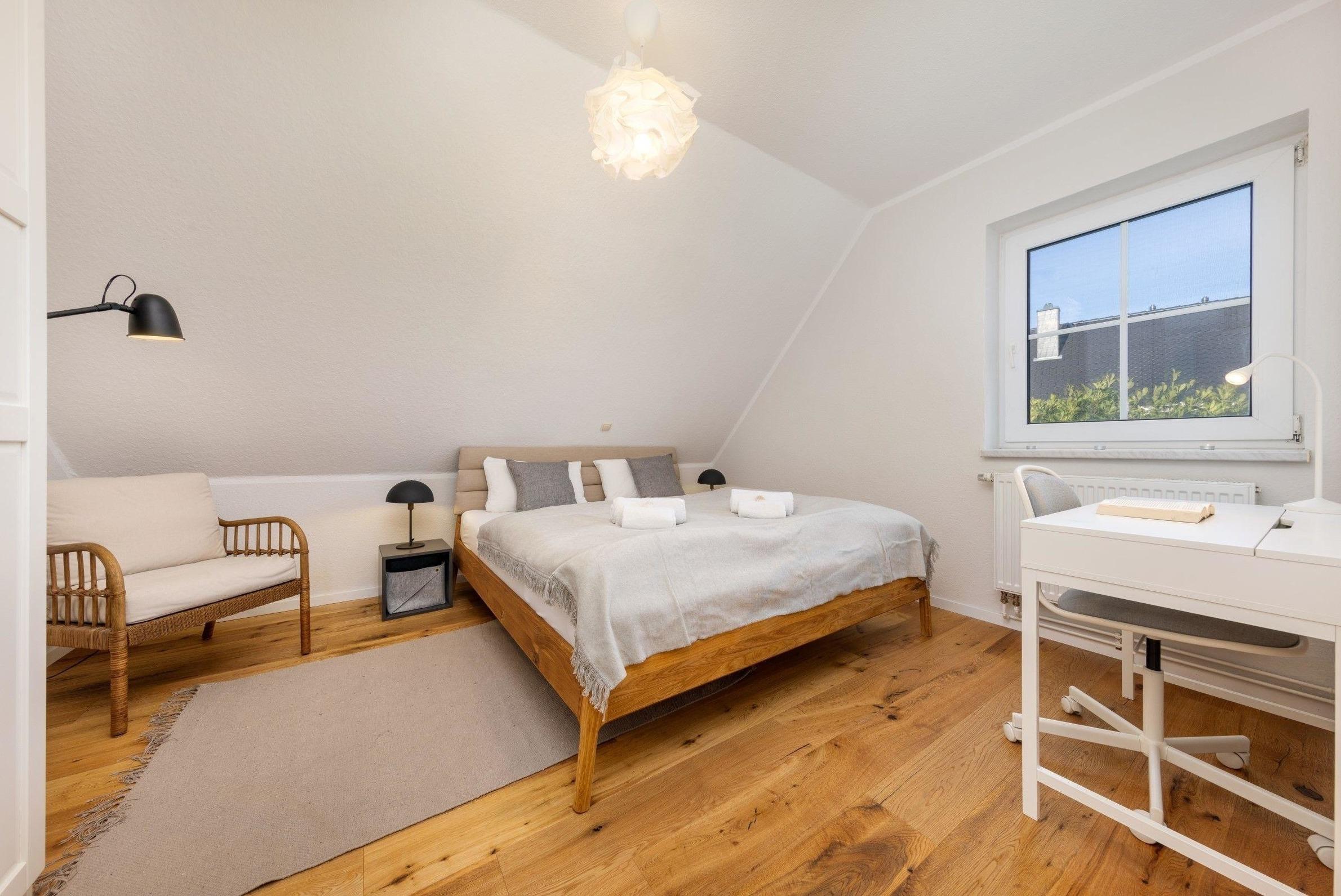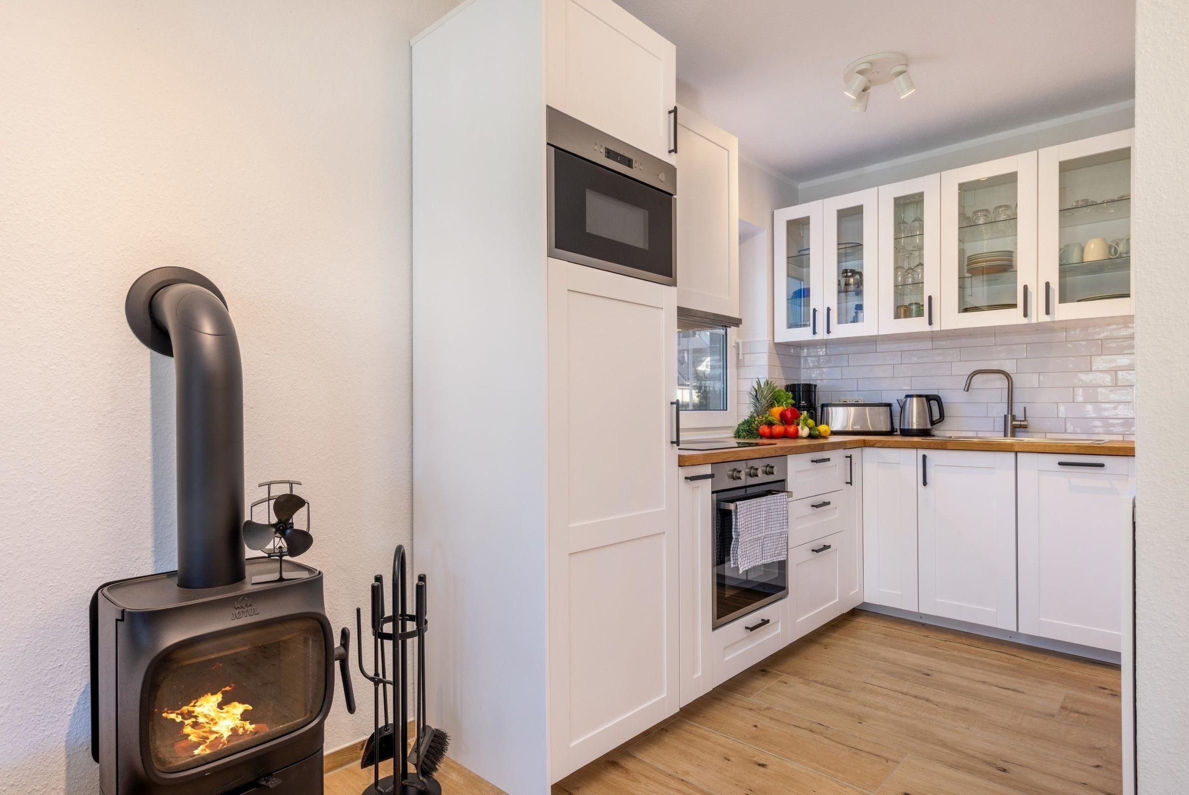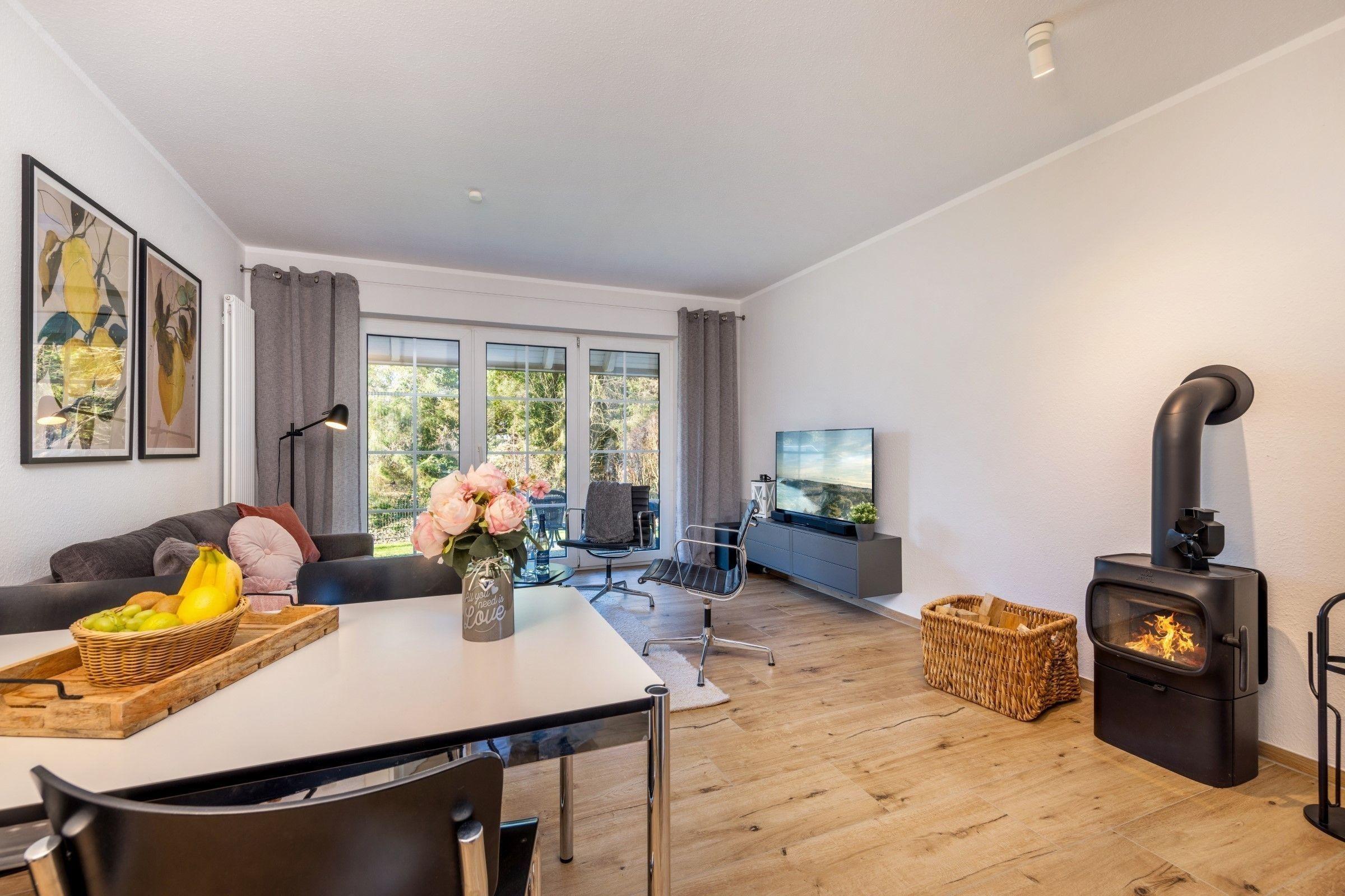 Die Ferienwohnung bietet auf 2 Schlafzimmern ausreichend Platz für Erholung und Entspannung. Eines der Schlafzimmer ist mit einem komfortablen Doppelbett ausgestattet, während das zweite Schlafzimmer mit zwei Einzelbetten aufwartet. Die offene Küche ist ideal für Selbstversorger und verfügt über moderne Geräte wie Geschirrspüler, Backofen, Elektro-/Gasherd sowie eine Mikrowelle. In der gemütlichen Sitzecke mit Sofa und Sessel kann man entspannen oder Spieleabende verbringen. Das Badezimmer mit Fenster und ein zusätzliches Gäste-WC sorgen für zusätzlichen Komfort. Zur Ausstattung gehören auch WLAN, TV, Waschmaschine und ein Kamin, der für eine wohlige Atmosphäre sorgt. Allergikerfreundliche Materialien garantieren einen erholsamen Aufenthalt. Ein Parkplatz steht ebenfalls zur Verfügung. Die liebevoll eingerichtete Wohnung ist der perfekte Rückzugsort für eine unbeschwerte Auszeit.