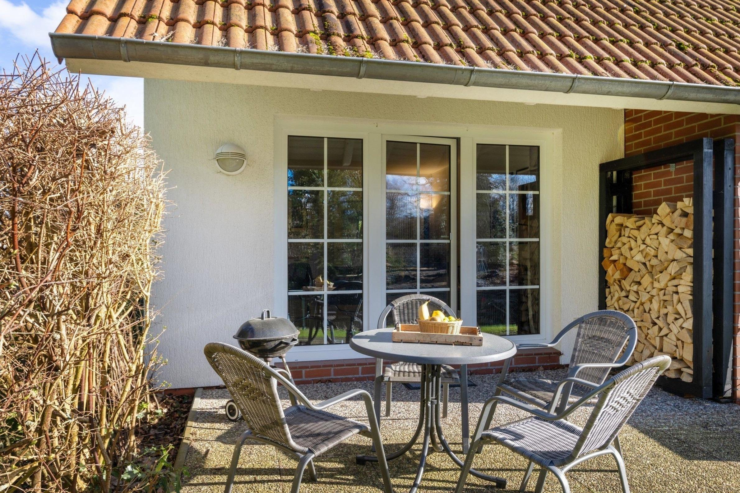 Die Ferienwohnung bietet einen privaten Außenbereich mit einer einladenden Terrasse und einem eigenen Garten. Gäste können entspannen und die Sonne auf der Liegewiese genießen oder gemeinsam mit Freunden am Holzkohlegrill leckere Speisen zubereiten. Dieser Außenbereich ist ideal, um unbeschwerte Stunden in der Natur zu verbringen und besondere Momente im Freien zu erleben.
