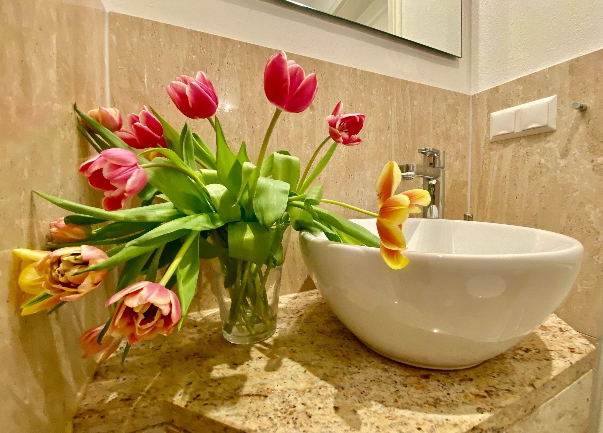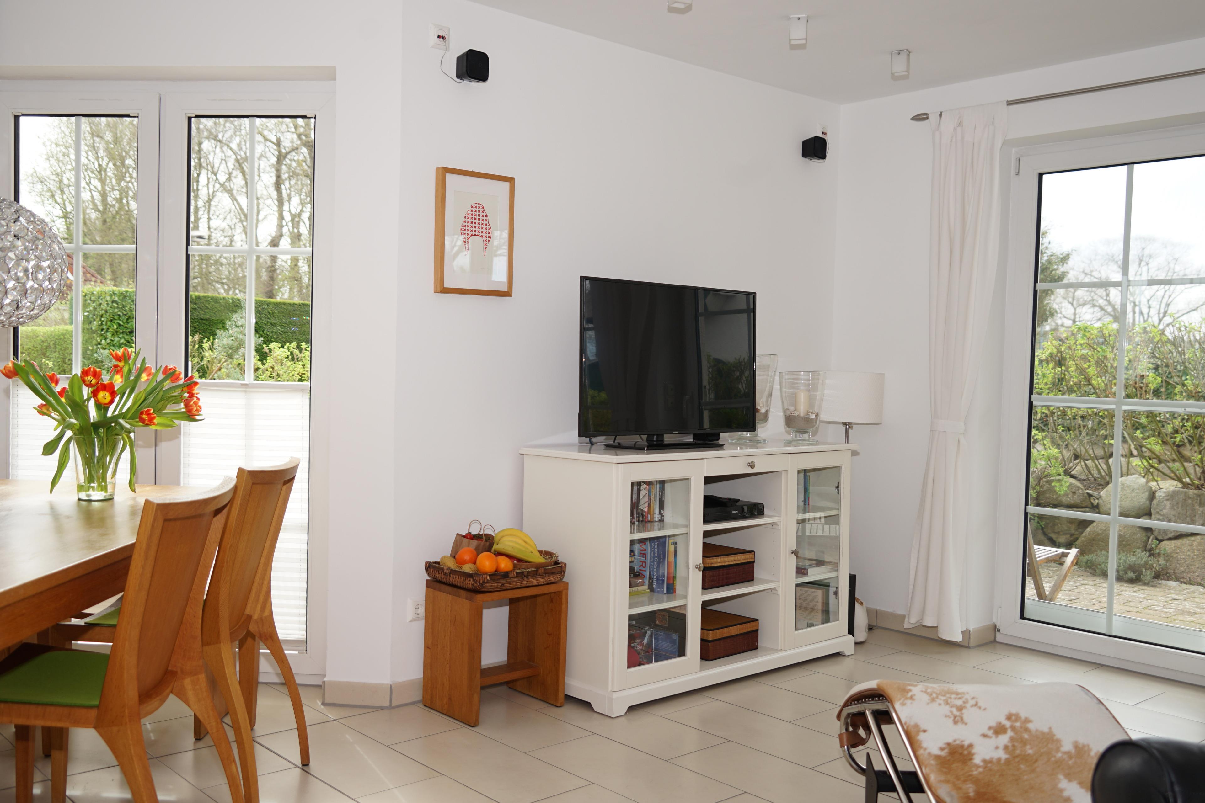 Modernes Design und einige erlesene Einzelstücke und Kunstwerke prägen das stylische Ambiente der großzügig und offen konzipierten Nichtraucher-Wohnung im Erdgeschoss. Lichtdurchflutende bodentiefe Fenster/Türen öffnen den Blick zur rosenumrankten Terrasse. Den hübsch angelegten Garten mit eigenem Kräutergärtlein an der Terrasse umgibt ein schützender Natursteinwall mit herrlichen Wildrosen. Auf ca. 70qm können sich vier Personen in diesem liebevoll ausgesuchten Ambiente ungezwungen wohlfühlen. Das Wohn- Esszimmer mit Kamin und einer offenen Küche laden zu jeder Tages- und Jahreszeit zum entspannten Verweilen ein. TV/DVD (Wohn- u. Schlafzimmer), SAT und W-LAN sorgen für ungehinderte Unterhaltung und Kommunikation. Eine kleine Bibliothek (auch mit DVDs) sorgt für Entspannung. Die Ausstattung der Küche lässt keine Wünsche offen. Sie umfasst einen Induktionsherd, Mikrowelle und Backofen, Geschirrspüler sowie Kühl- und Kühlgefrierschrank, Kaffeemaschine, Wasserkocher, Toaster, Waffeleisen sowie zahlreiche nützliche Küchenhelfer. Die Wohnung verfügt über zwei Badezimmer mit jeweils geräumiger bodengängiger Dusche und WC (1 Tageslichtbad), 2 Doppelschlafzimmer mit begehbarem bzw. großem Kleiderschrank sowie einer Abstellkammer mit Garderobe. Der Waschraum samt Waschmaschine/Trockner bietet Platz für Wäschehalter und Bügelbrett. Die Wohnung verfügt über hochwertige Gartenmöbel aus Holz, einen überdachten Freisitz mit Eßbank, großen Tisch, Sonnenschirm und Sonnenliegen und Bollerwagen. Zwei Parkplätze befinden sich unmittelbar neben dem Haus. Im Gartenhaus können Fahrräder trocken verstaut werden.