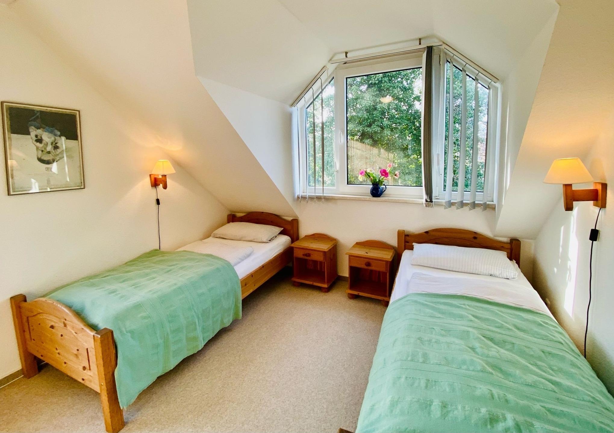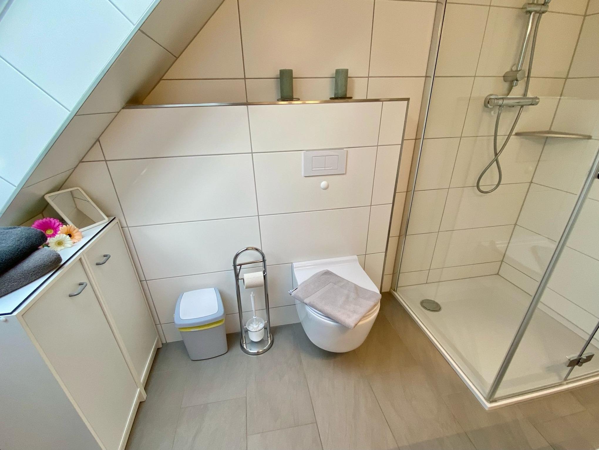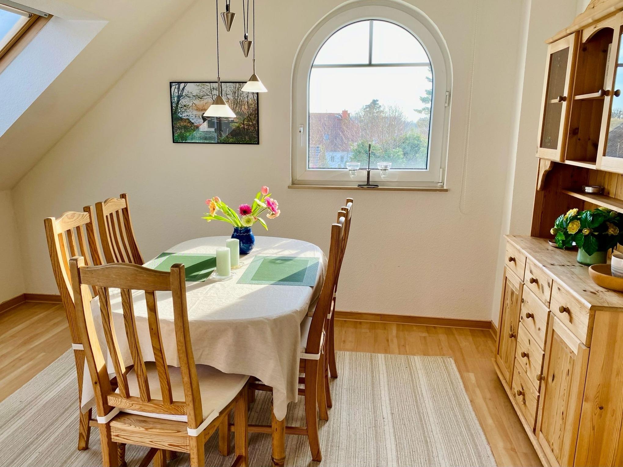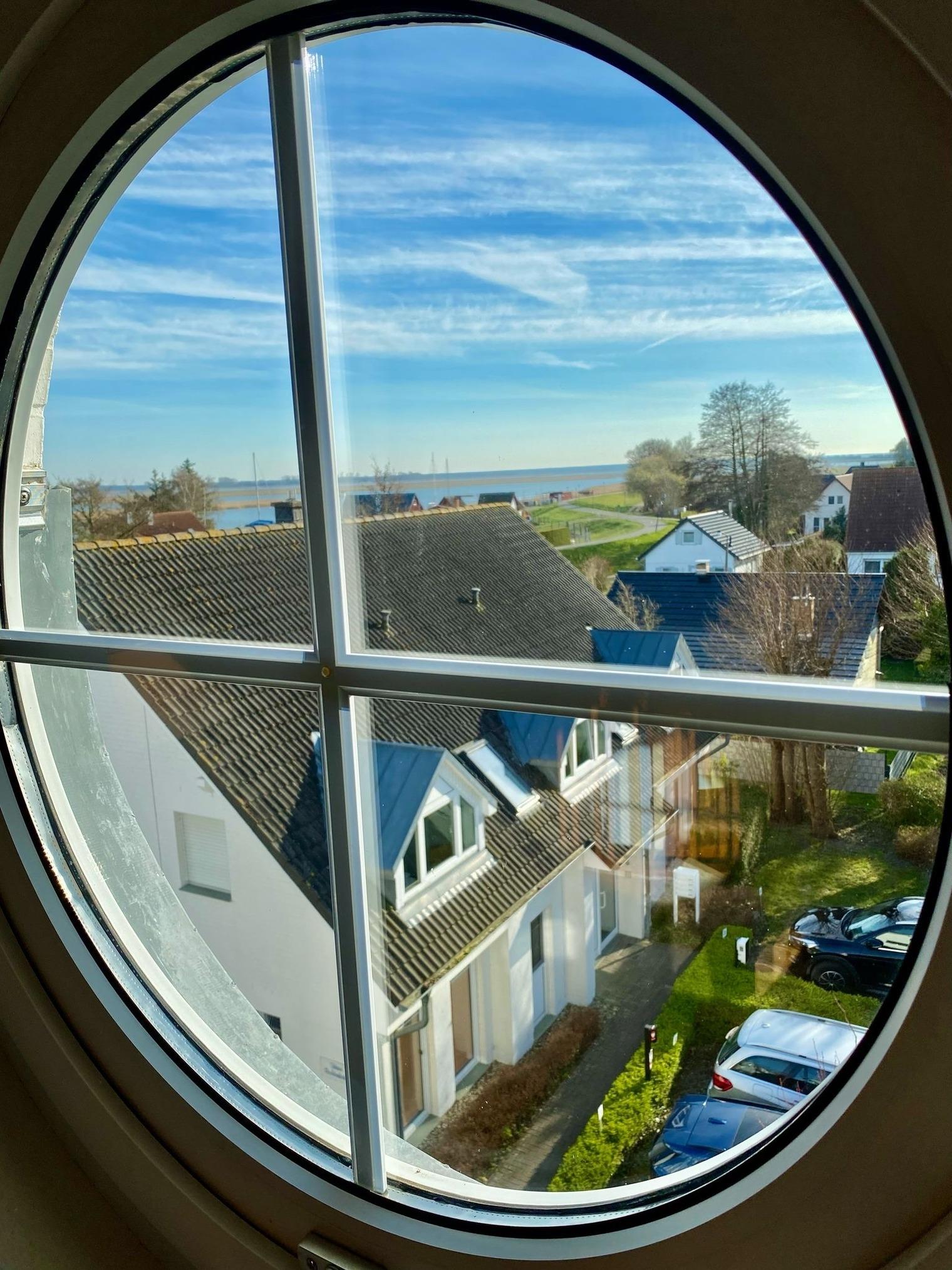 Die 72 qm große Wohnung liegt im 2. Stock. Eine Wendeltreppe führt auf den ausgebauten Spitzboden mit Galerie zum Wohnzimmer - besonders beliebt zum separaten Wohnen von Kindern. Hier hat man über ein Rundfenster einen guten Ausblick über den Boddendeich bis hin zur Meiningenbrücke. Die separate Küche und ein gerade restauriertes modernes Duschbad erhöhen den Wohnkomfort.