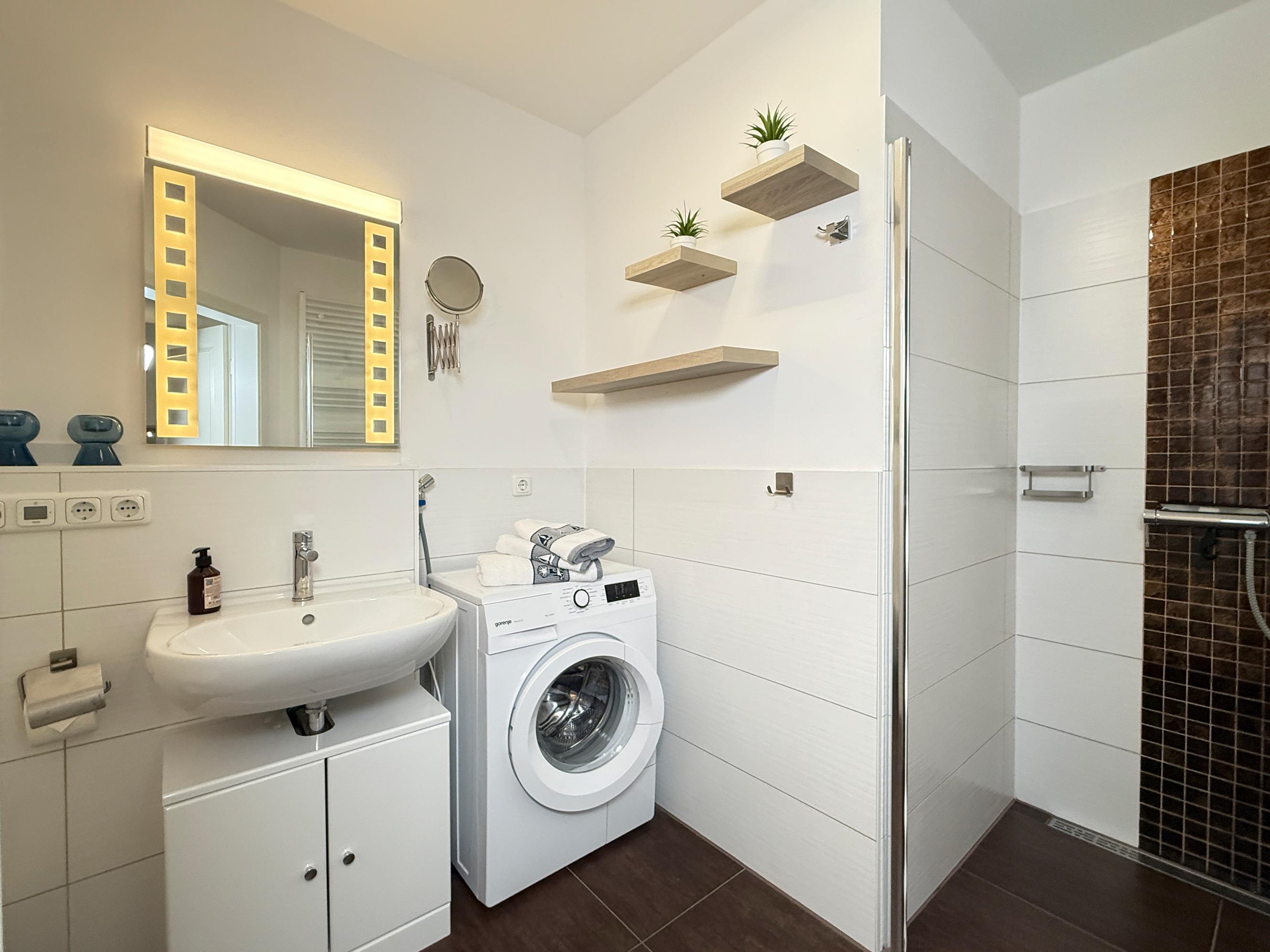 Modernes Badezimmer mit barrierefreier Regendusche, Fußbodenheizung und Waschmaschine