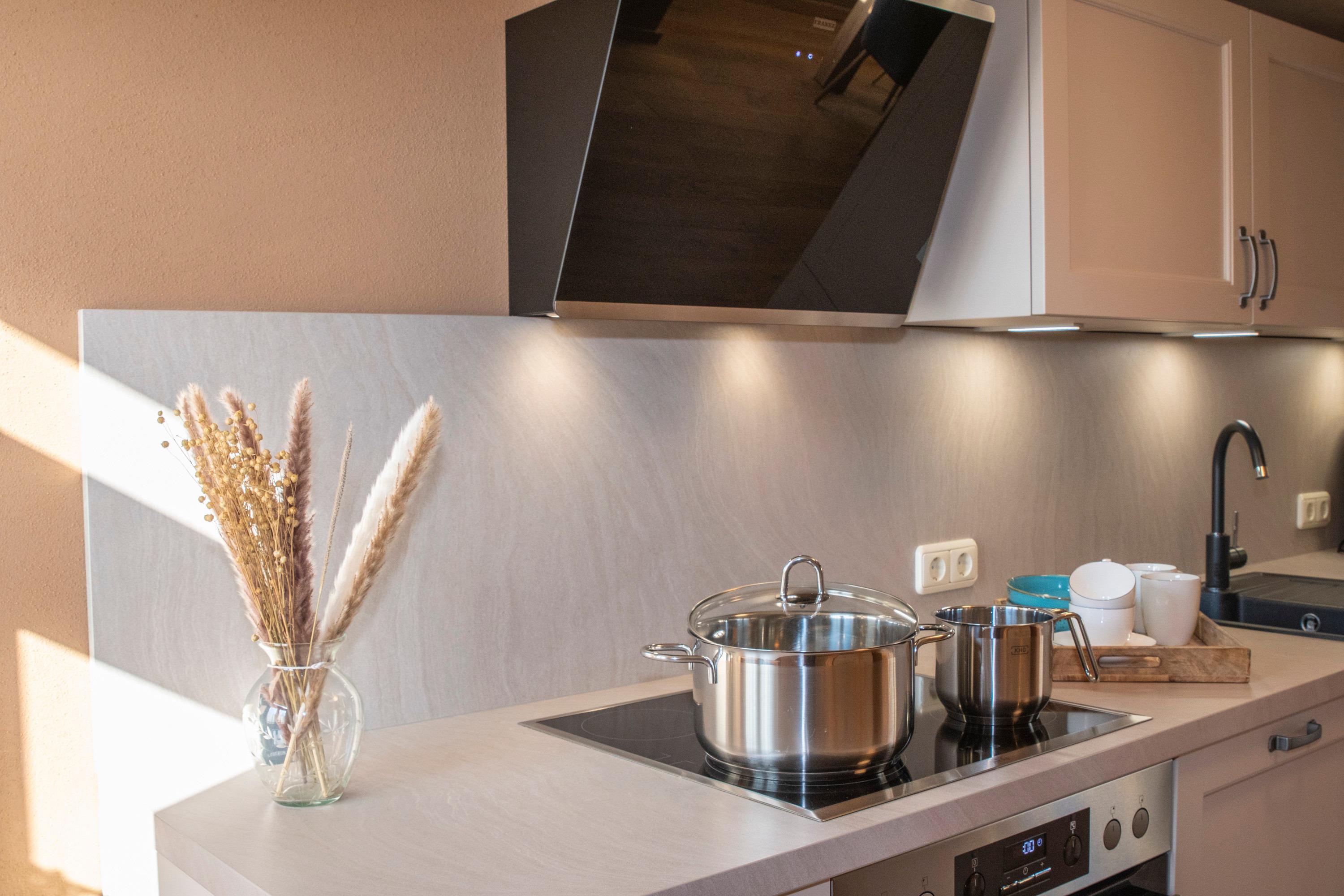 Voll ausgestattete Küche: Kochfeld, Backofen, Geschirrspüler, Kühlschrank und Filterkaffeemaschine