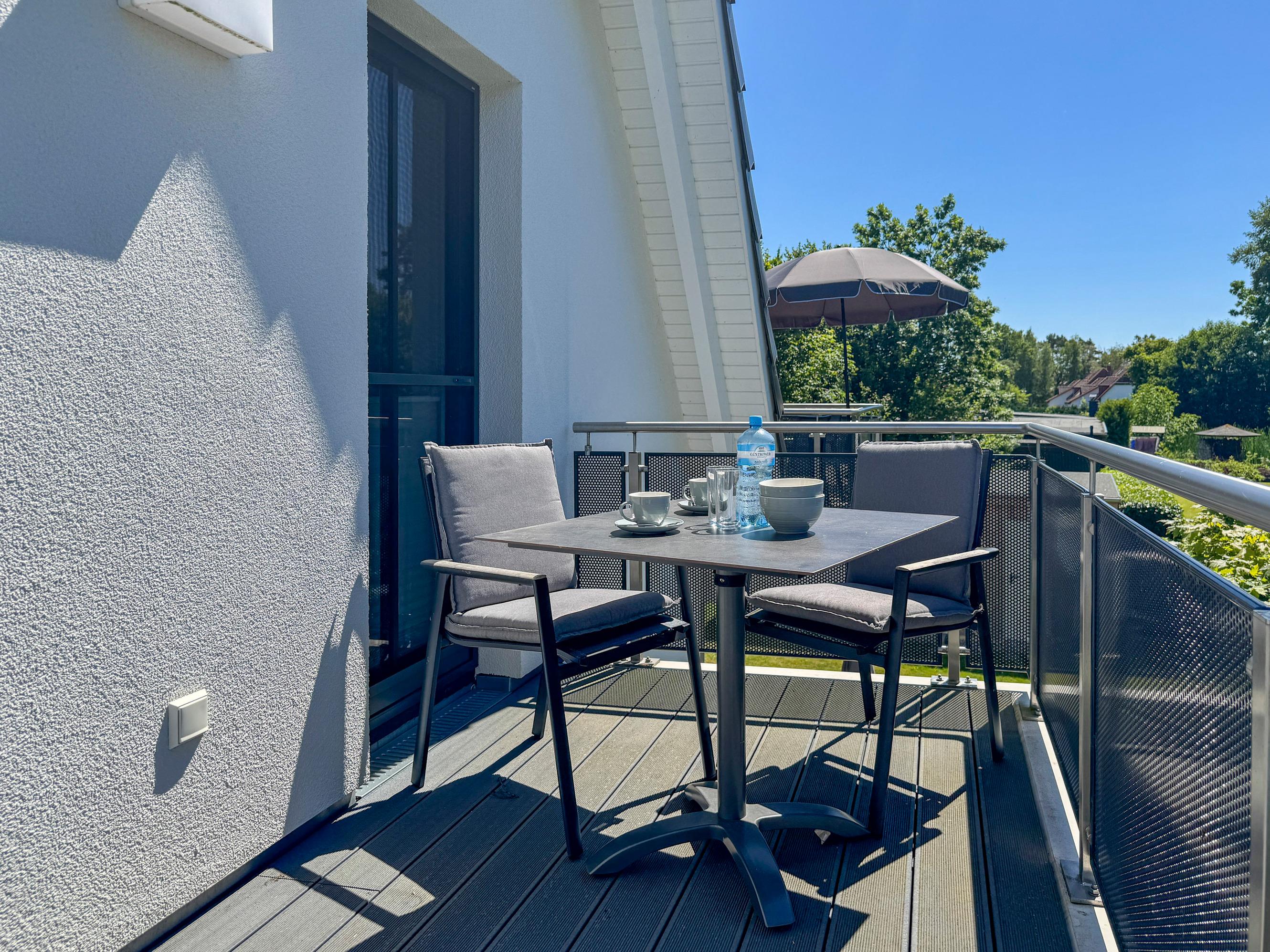 Beginnen Sie den Tag mit einem Frühstück auf dem sonnigen Balkon und lassen Sie den Blick über die Dächer von Zingst in Richtung Himmel und Meer schweifen.