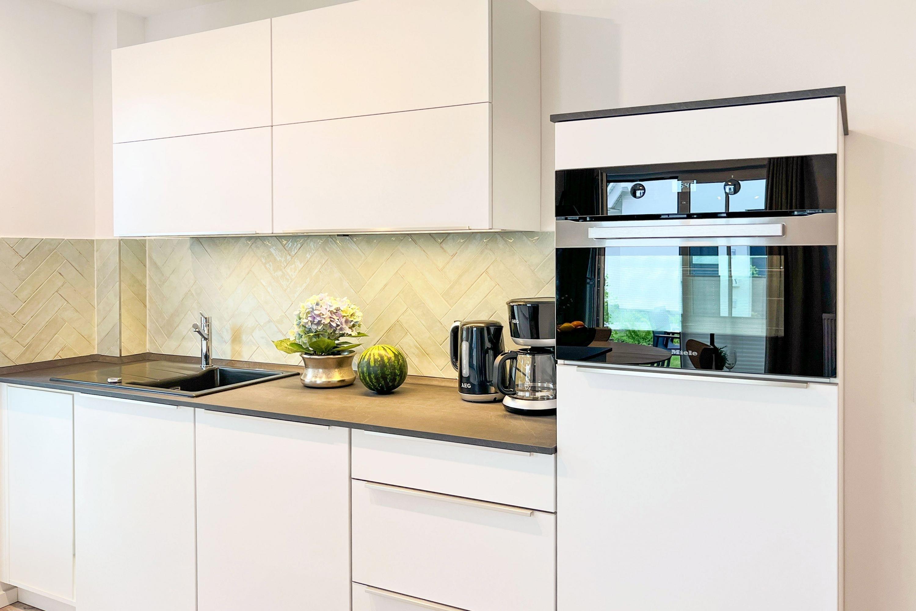 In der modernen Küche bereiten Sie mühelos kleine Lieblingsgerichte zu, und das komfortable Boxspringbett im Schlafzimmer sorgt anschließend für erholsame Nächte und süße Träume vom Meer.