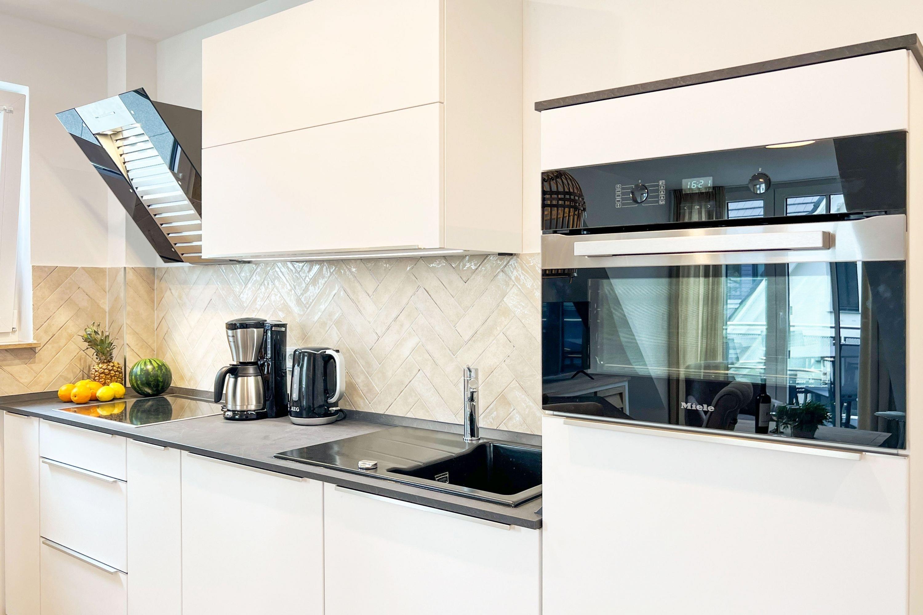 Voll ausgestattete Küchenzeile mit Backofen, Kochfeld, Kühlschrank, Spülmaschine, Toaster, Wasserkocher und Filterkaffeemaschine