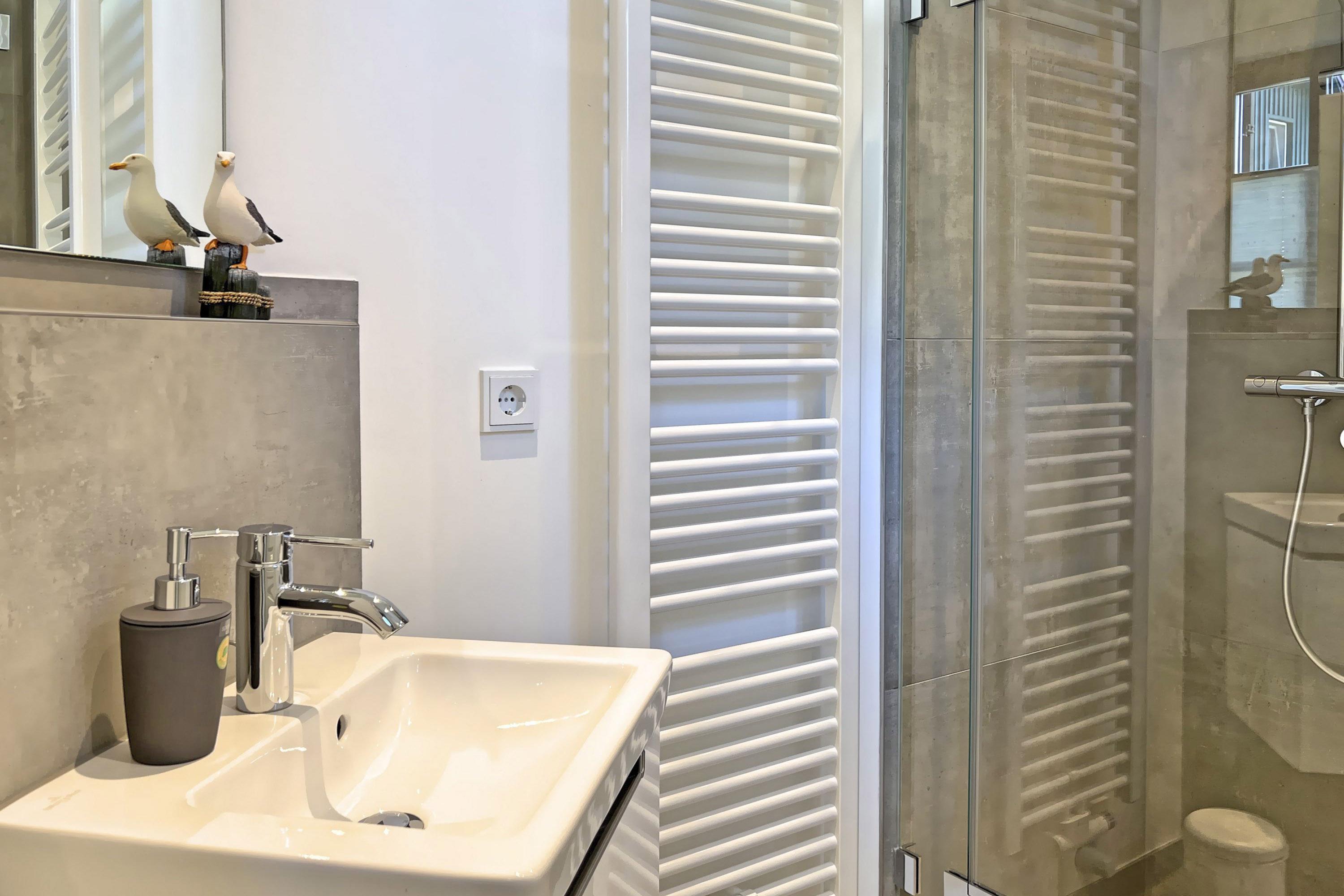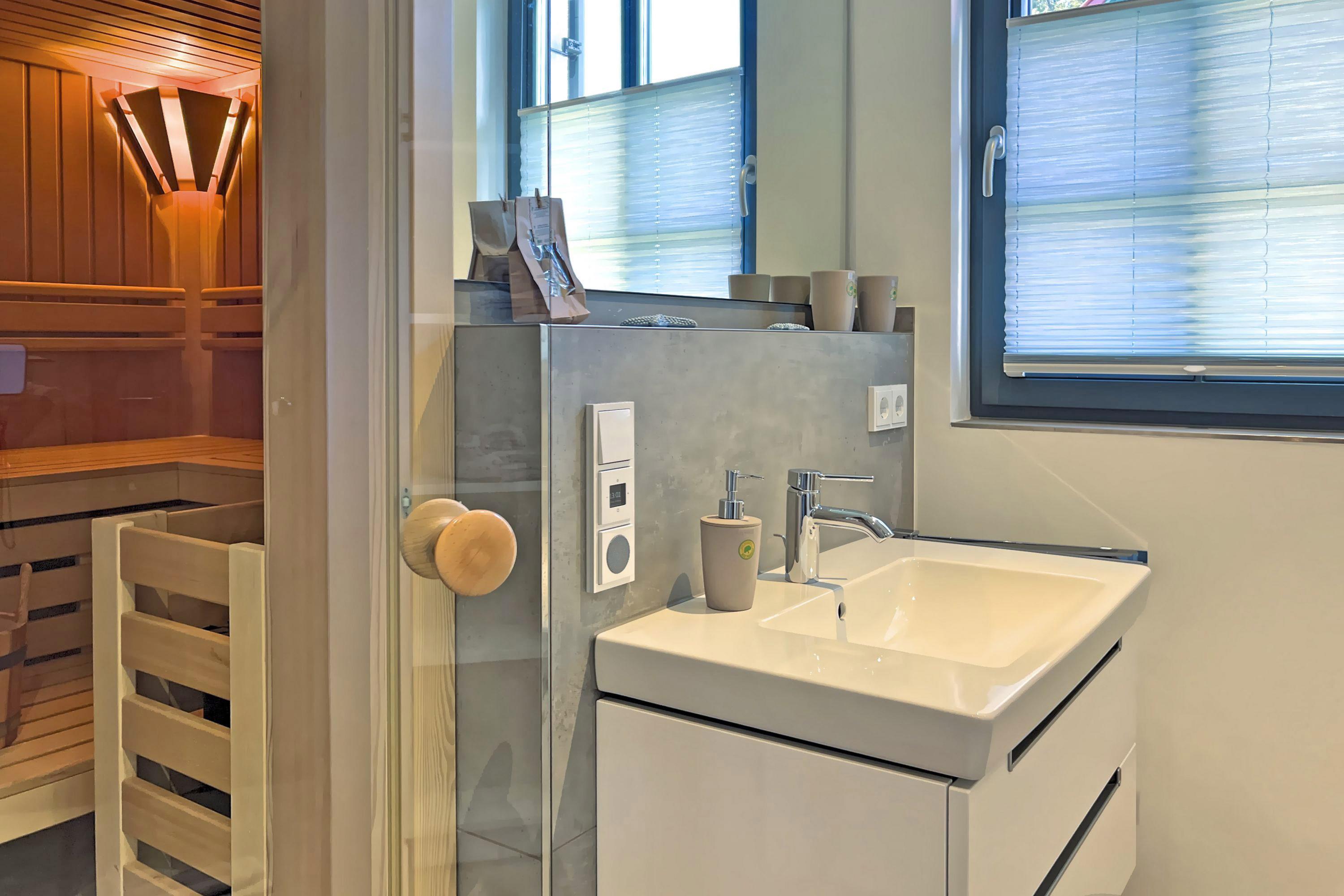 Die Sauna ist eine Oase der Erholung, perfekt, um nach einem aktiven Tag Körper und Geist zu regenerieren. Die ebenerdige Dusche bietet Komfort und Frische – ein Highlight nach der Sauna oder einem Tag in der Natur.