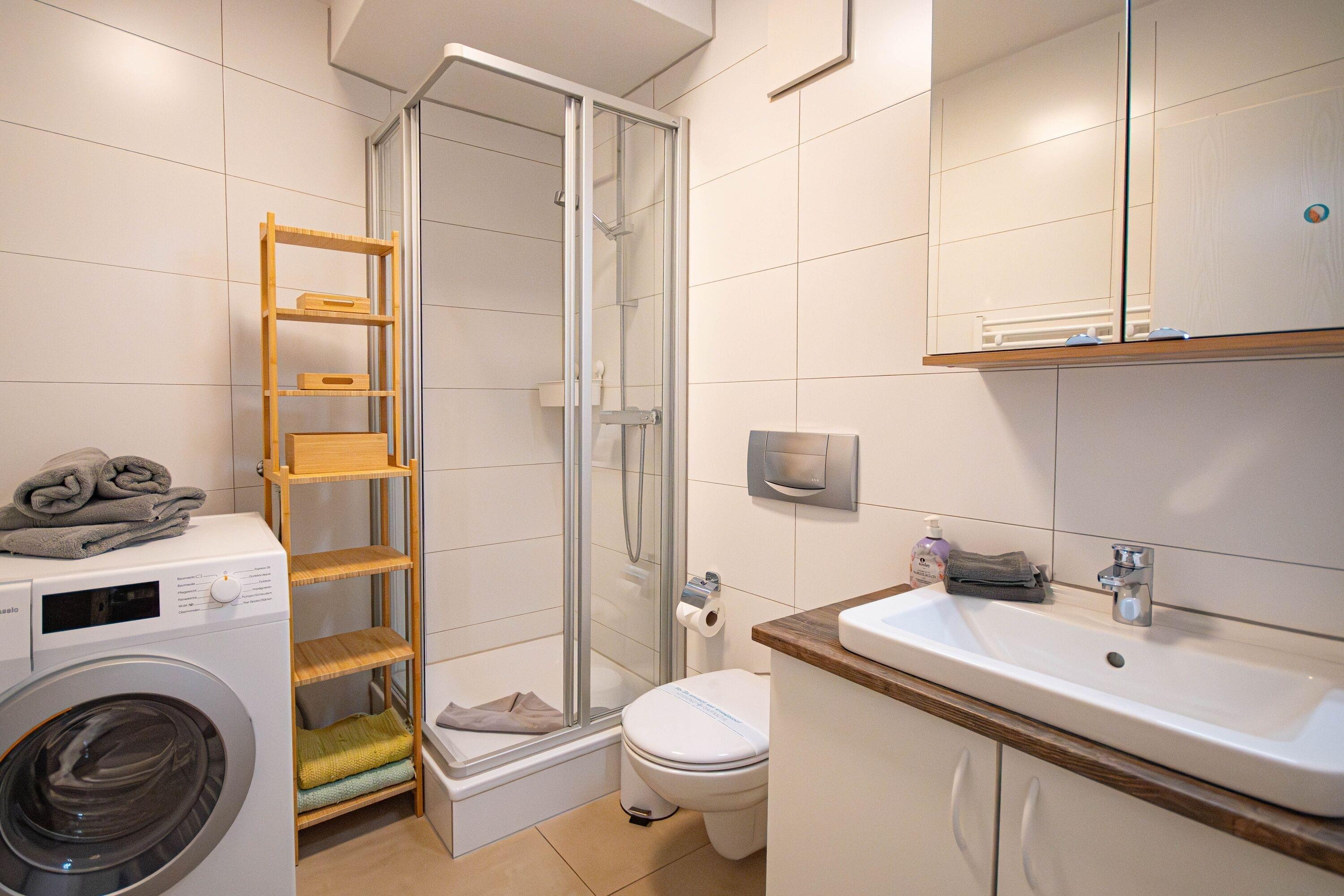 Badezimmer: Modernes Bad mit Dusche und Waschmaschine für zusätzlichen Komfort.