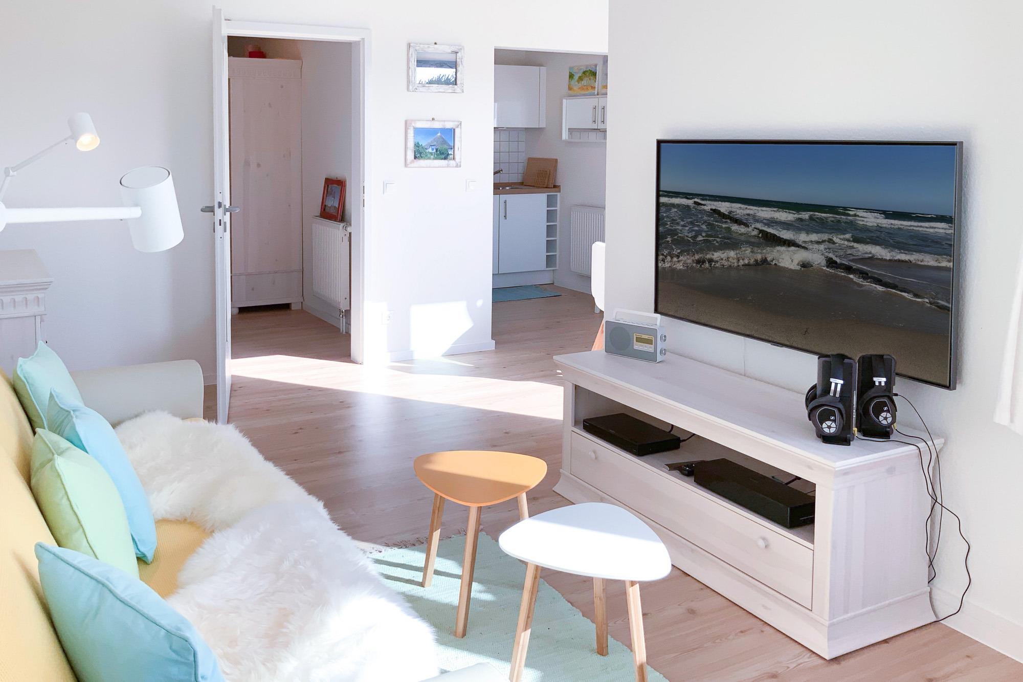 Wohnbereich: Heller Wohn- und Essbereich mit bequemer Couch und großem Fernseher für entspannte Stunden.