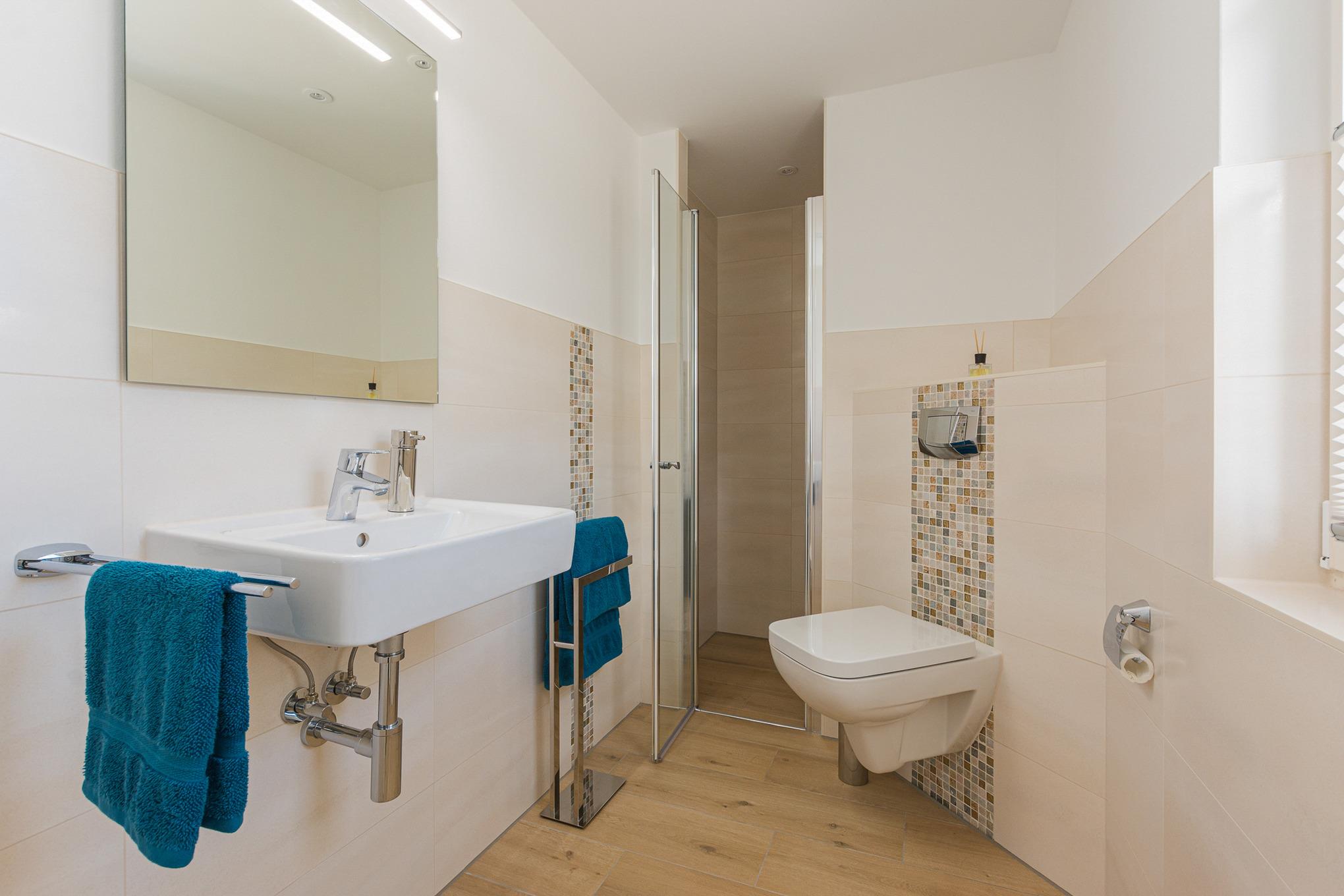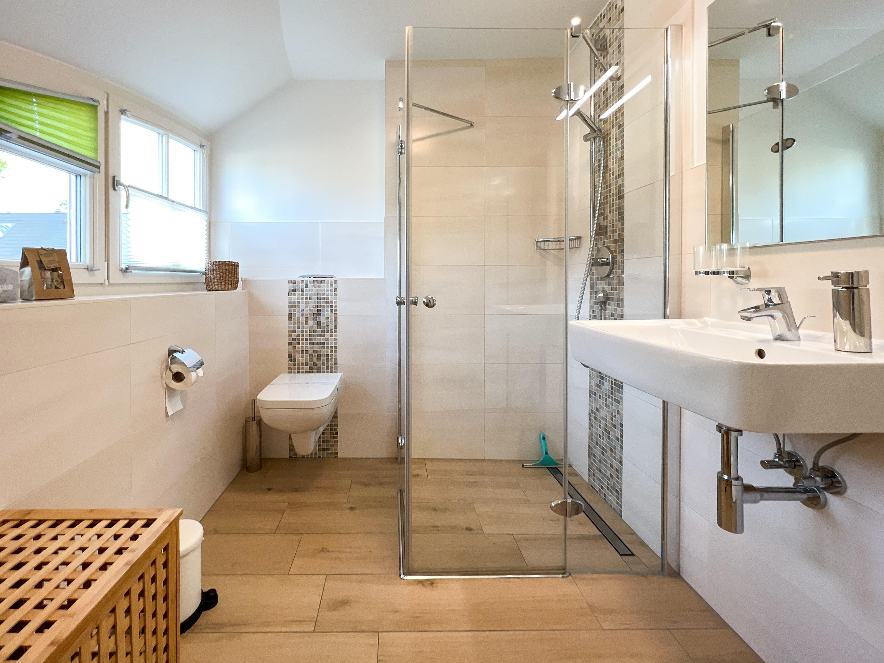 Zwei Badezimmer: beide mit ebenerdigen Duschen, eines zusätzlich mit Badewanne