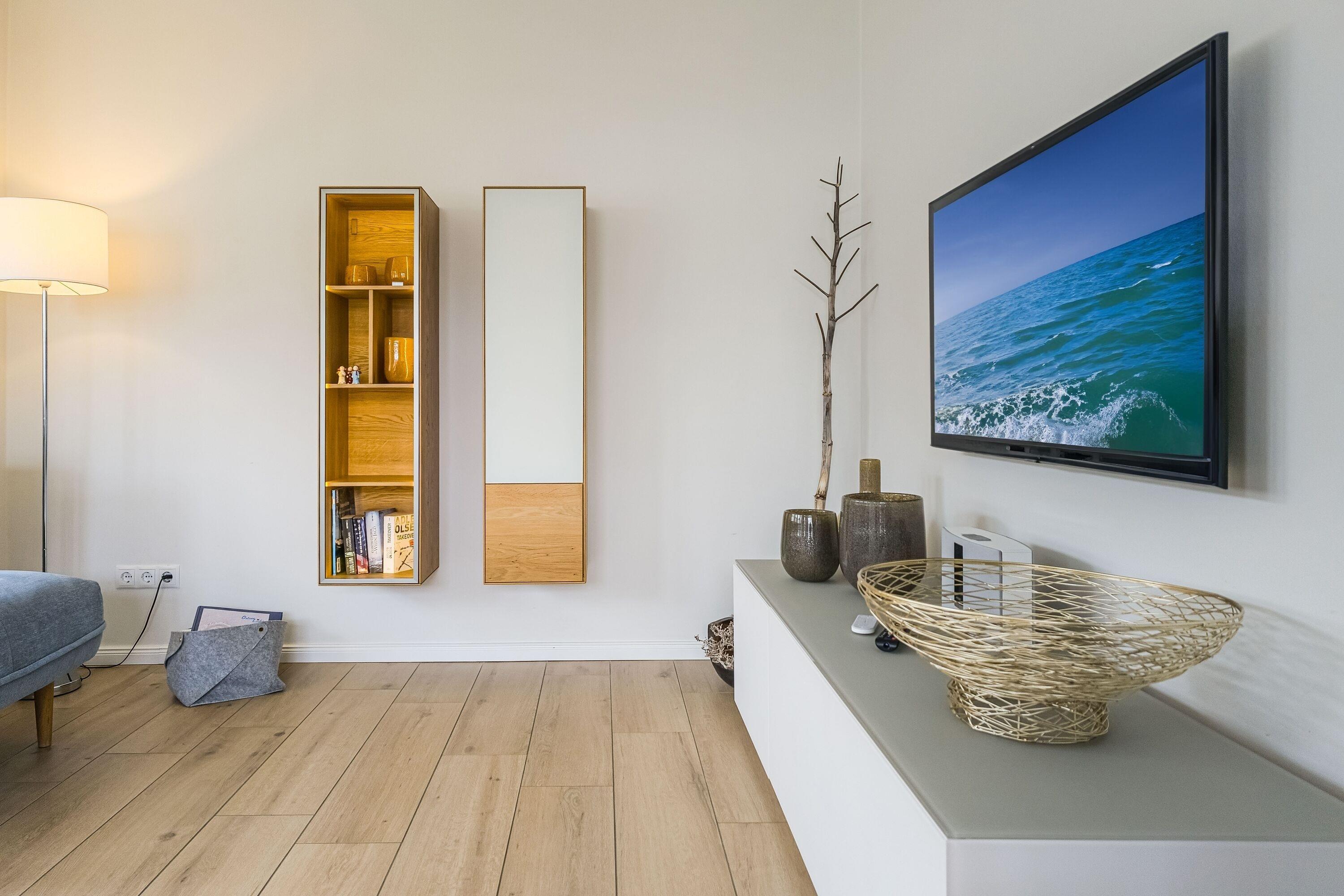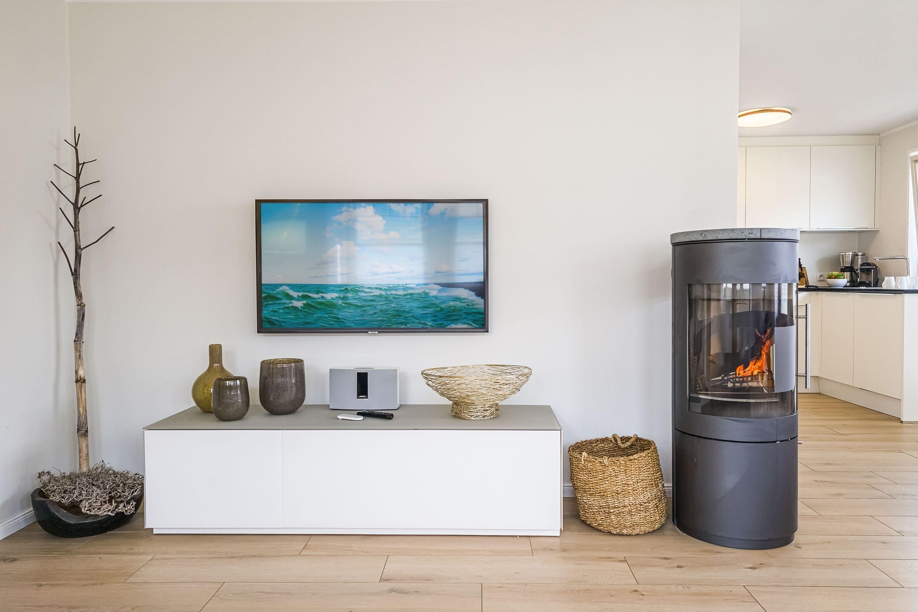 Gemütlicher Wohnbereich mit Kaminofen und Smart-TV