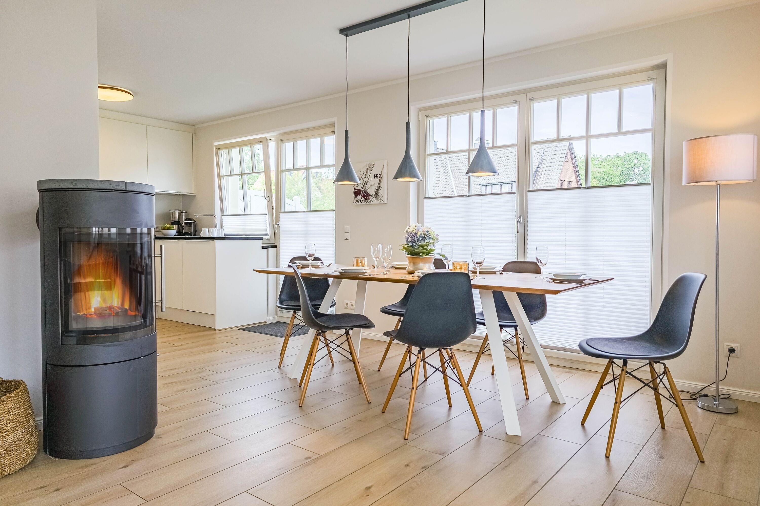 Das Ferienhaus Kranschehus empfängt Sie mit einer warmen und einladenden Atmosphäre. Der großzügige Wohnbereich mit Kaminofen ist das Herz des Hauses und lädt zu entspannten Abenden ein – sei es bei einem guten Buch oder einem gemeinsamen Spieleabend. Die moderne Küche ist vollständig ausgestattet, sodass Sie mühelos köstliche Mahlzeiten für Ihre Liebsten zubereiten können.