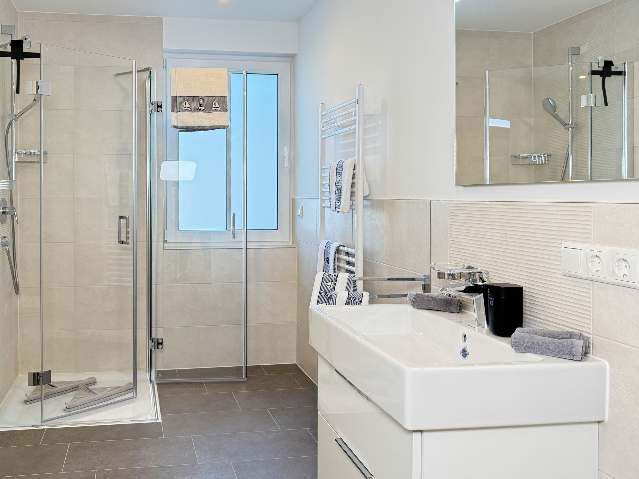 Badezimmer: Modernes Bad mit ebenerdiger Dusche, Fußbodenheizung und Haartrockner für zusätzlichen Komfort.