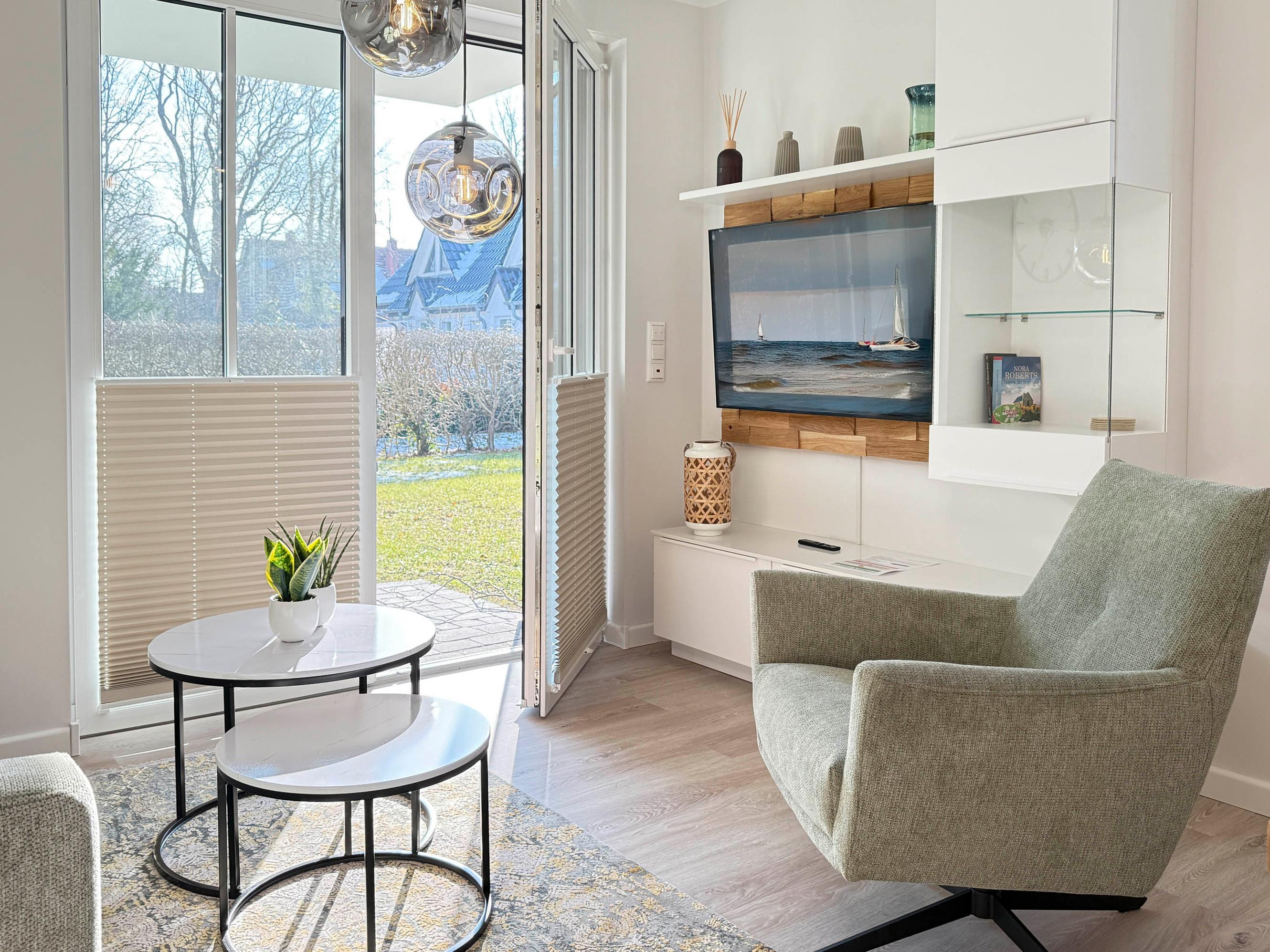 Wohnbereich: Heller Wohnraum mit bequemer Sitzgruppe und Smart-TV für entspannte Stunden.