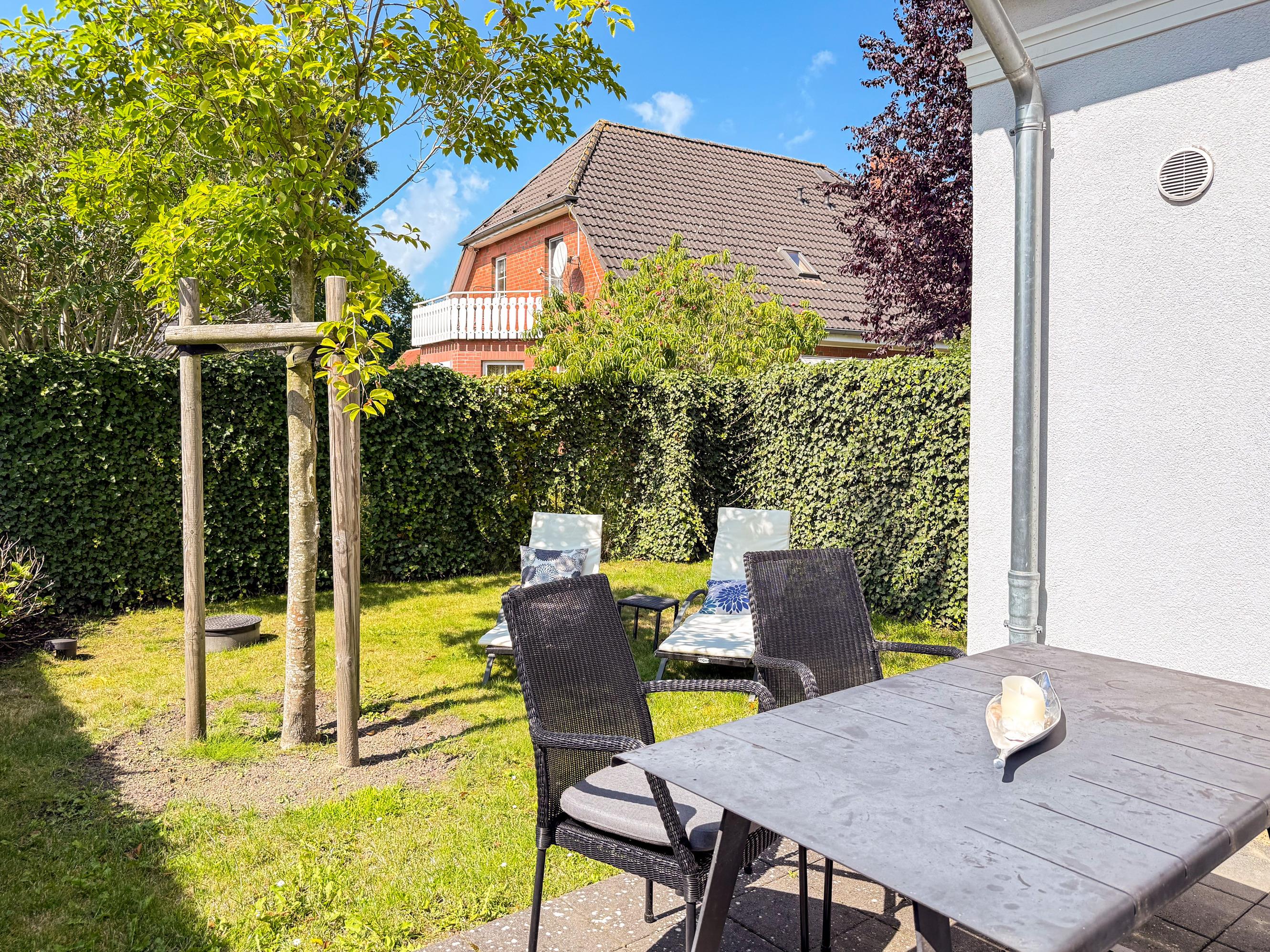 Hier genießen Sie beim Frühstück den Blick ins Grüne oder verbringen gemütliche Abende auf der Terrasse, während die Abendsonne langsam hinter den Dünen verschwindet.