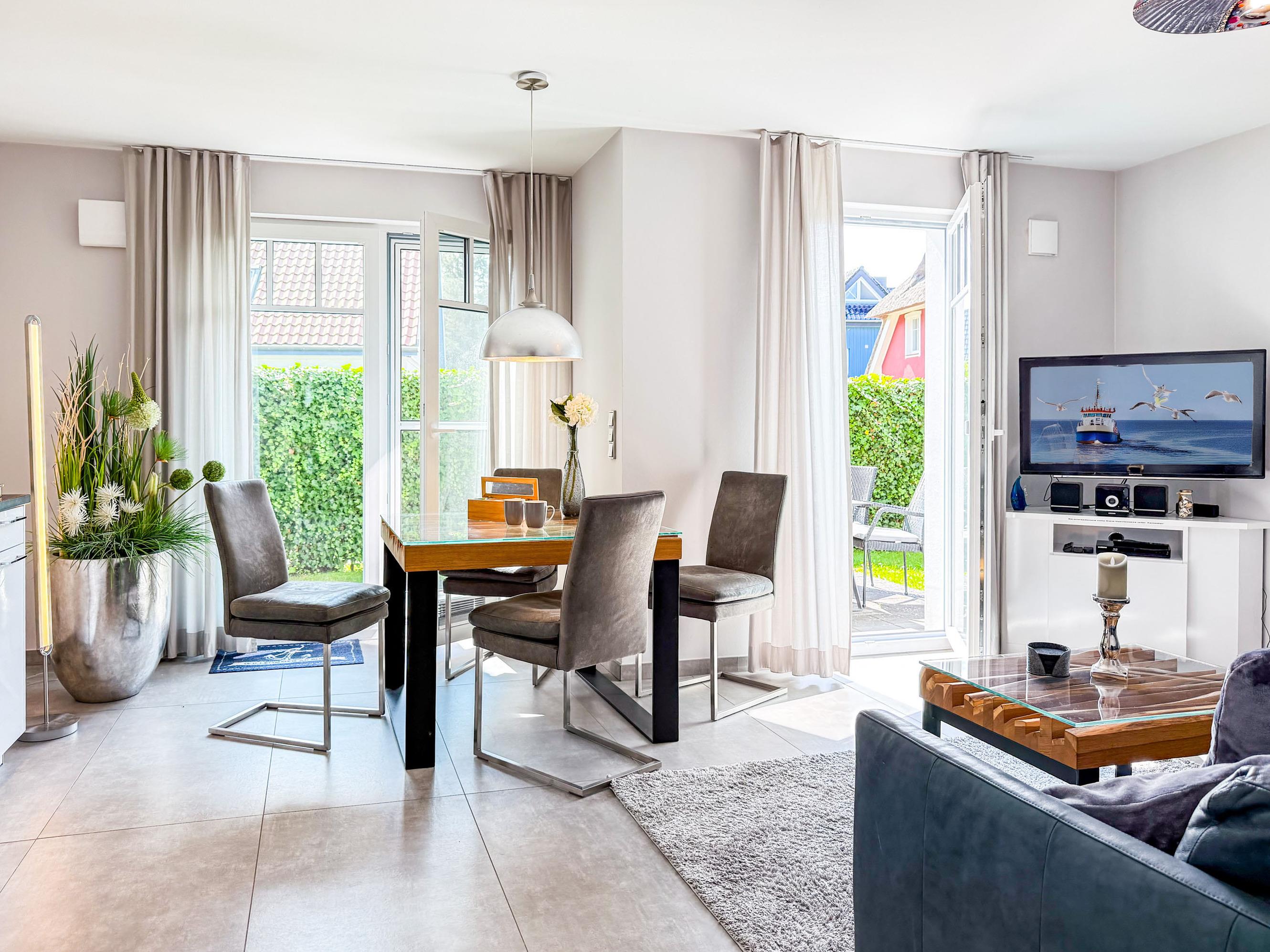 Offener Wohn- und Essbereich mit Zugang zur Terrasse, bequemer Couch, Esstisch, Smart-TV und bodentiefen Fenstern mit Gartenblick