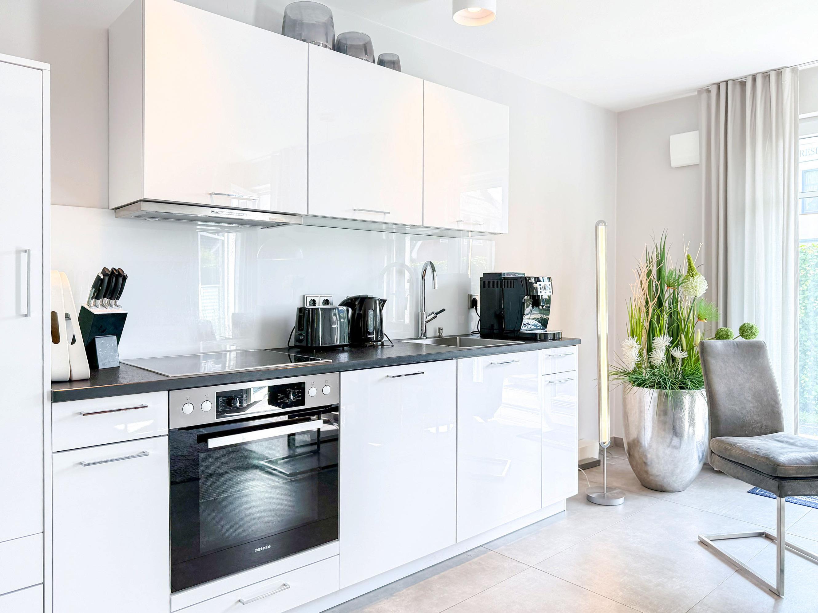 Voll ausgestattete Küche mit Cerankochfeld, Backofen, Kühlschrank mit Gefrierfach, Spülmaschine, Kaffeevollautomat, Toaster und Wasserkocher