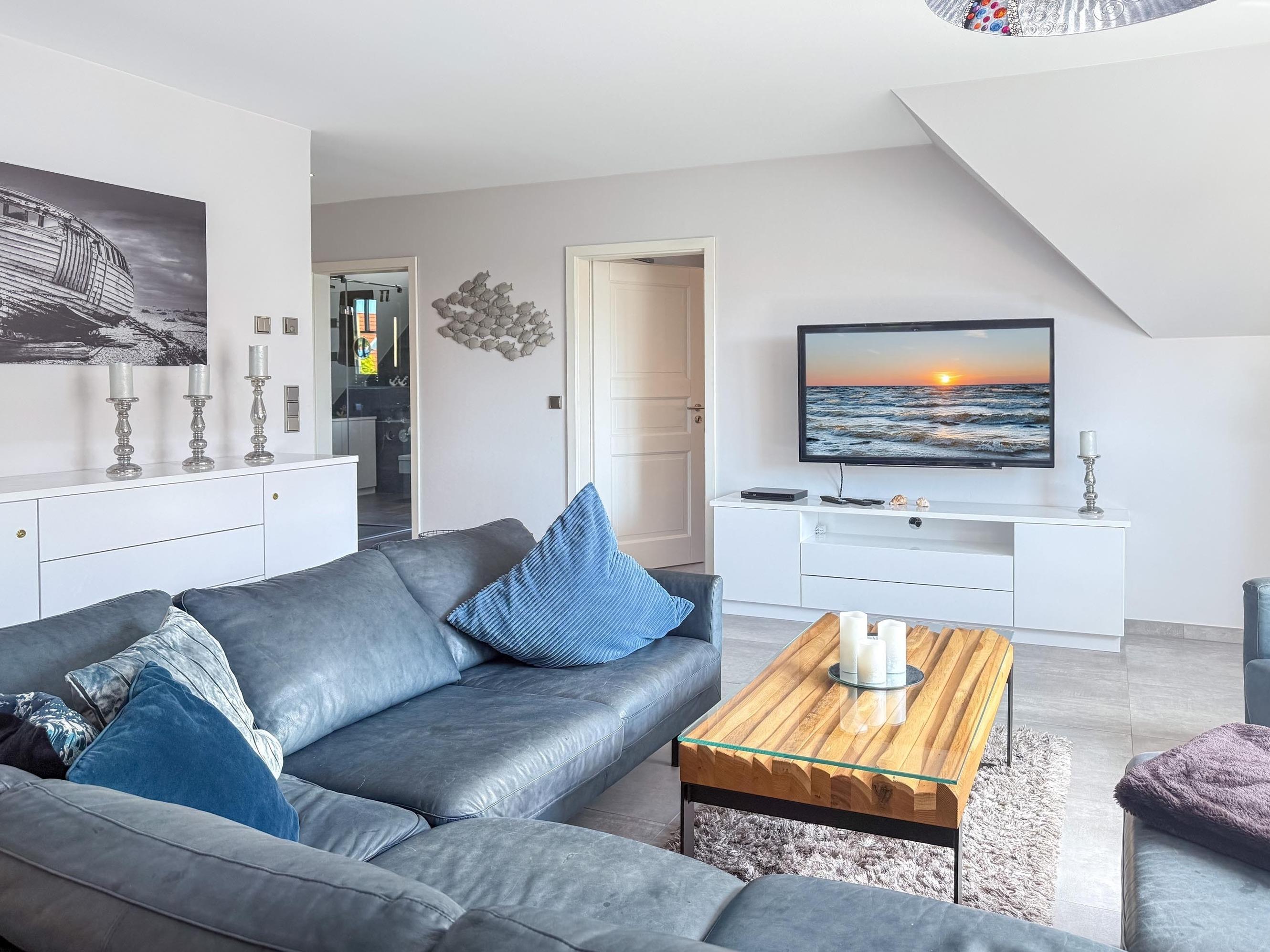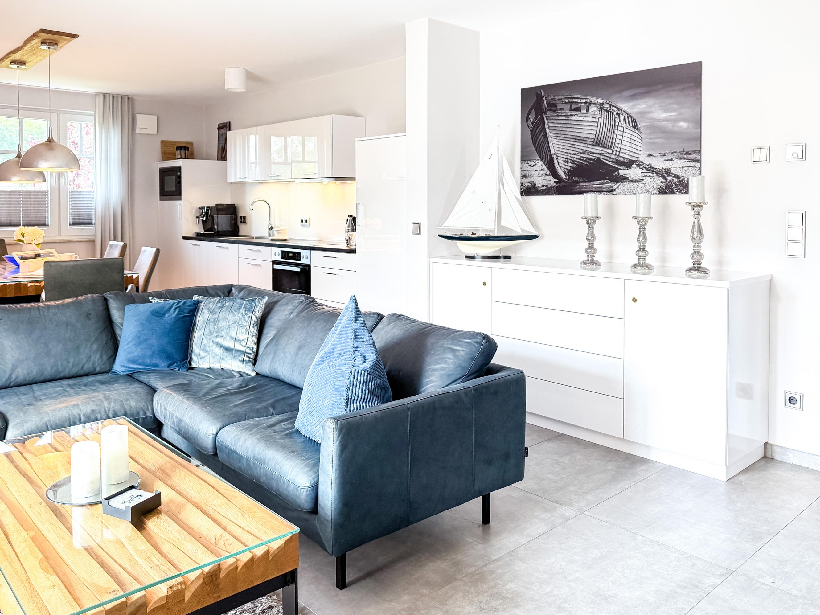 Die Ferienwohnung Meerle 4 vereint modernes Design mit einem wohnlichen Ambiente, das sofort ein Gefühl von Ankommen vermittelt. Der offene Wohn- und Essbereich mit seinen hellen Farben und liebevollen Details lädt zum Zusammensein ein – ob beim Frühstück, einem gemütlichen Filmabend oder entspannten Stunden nach einem Tag am Strand.