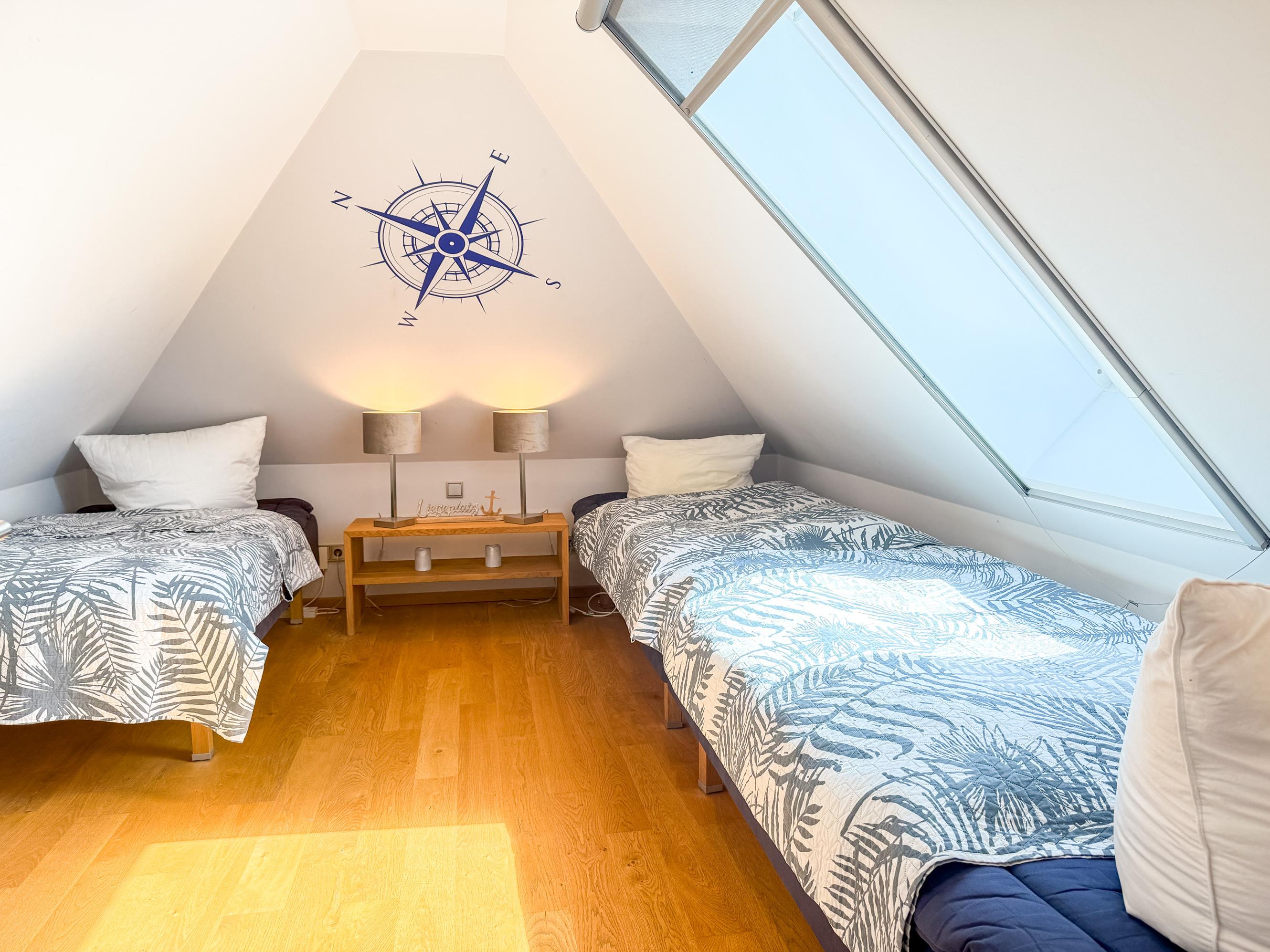 Schlafzimmer: Ein Doppelzimmer im Obergeschoss, ein Kinderzimmer mit drei Einzelbetten im Dachgeschoss – ideal für Familien oder Freunde