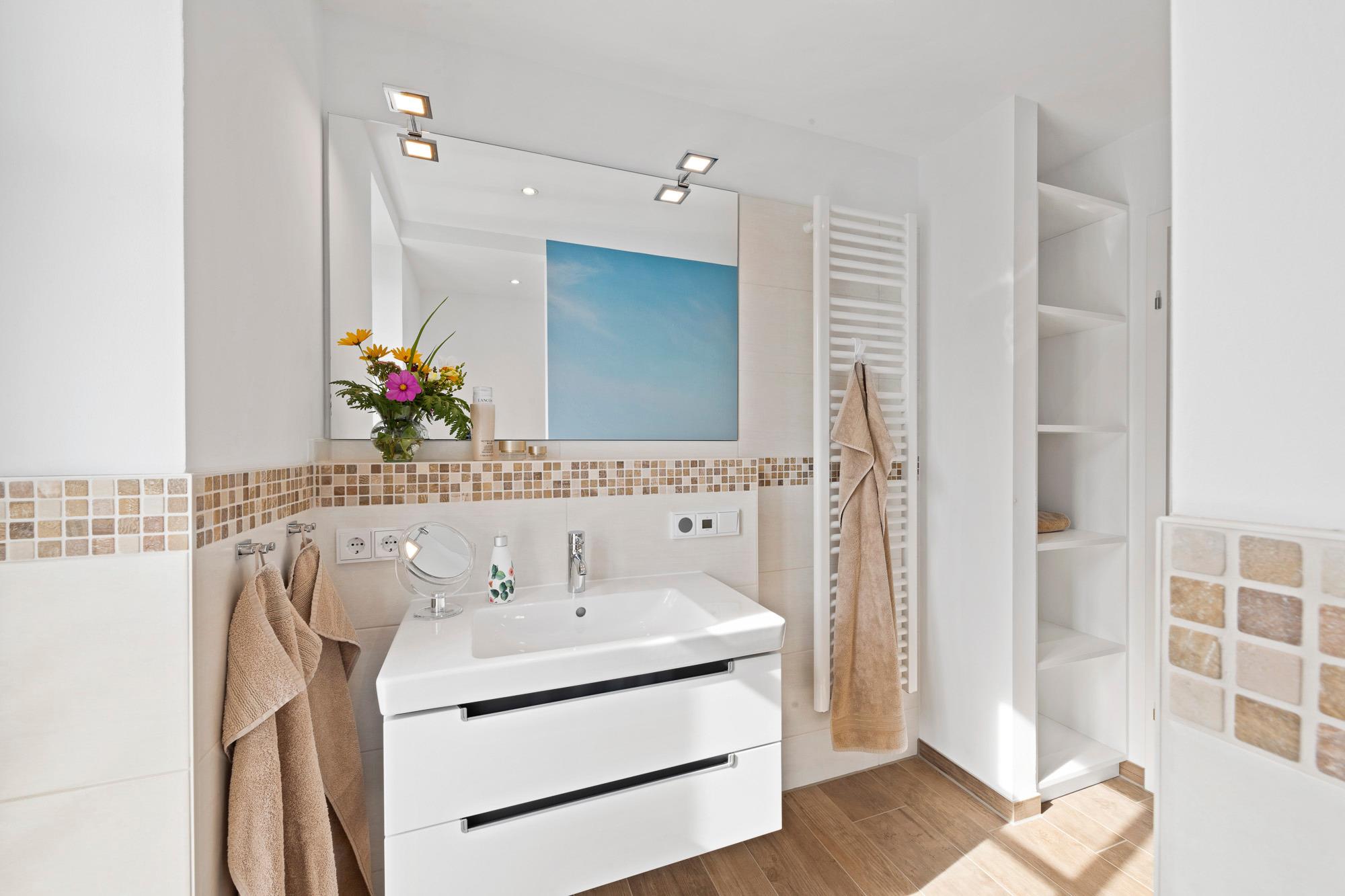 Modernes Badezimmer: Helles Tageslichtbad mit Fußbodenheizung und Regendusche.