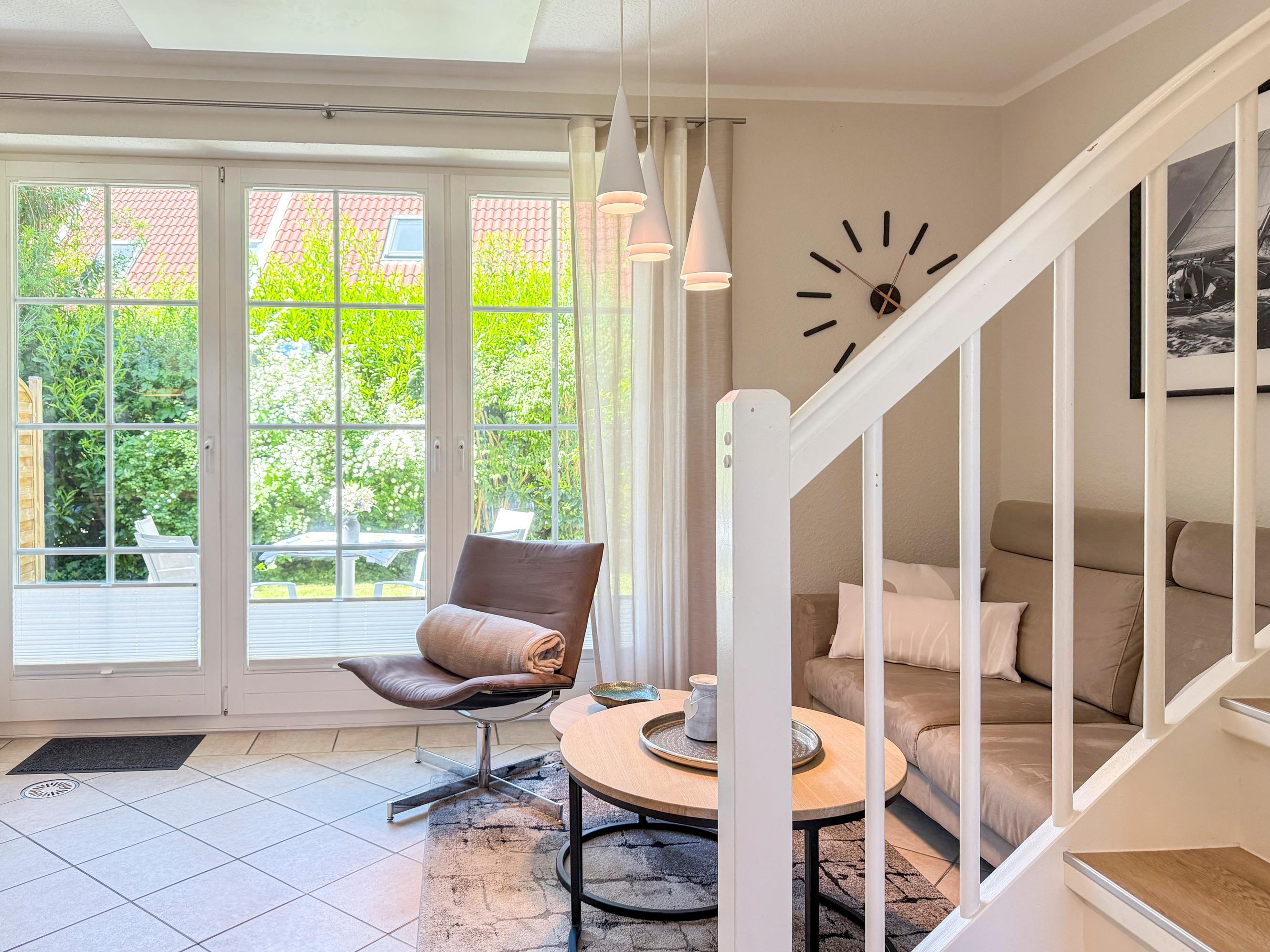 Wohn- und Essbereich: Gemütlicher Wohnraum im Erdgeschoss mit weichem Sofa, Sessel und großem Esstisch.