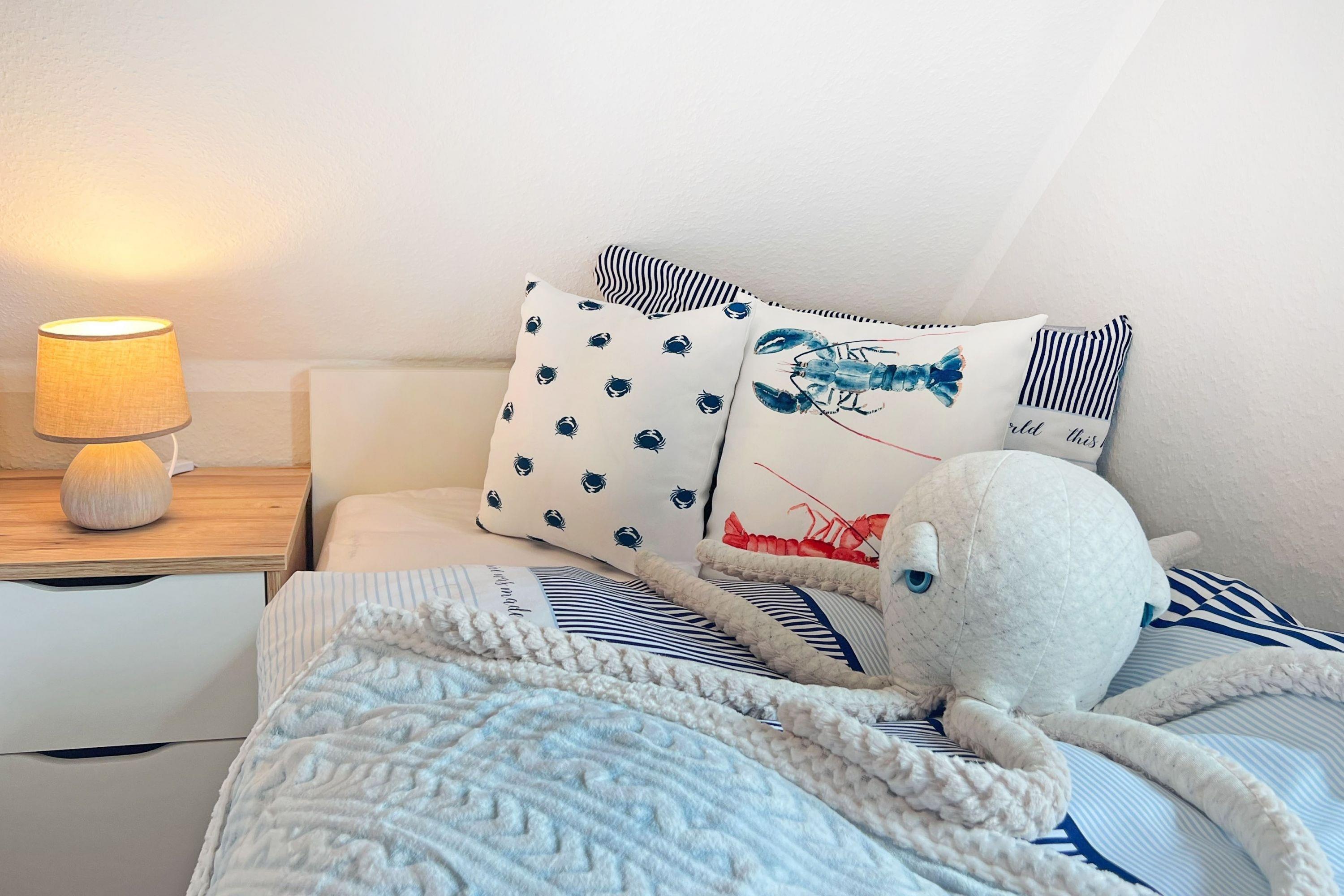 Schlafzimmer: Ein Schlafzimmer mit komfortablem Doppelbett und ein Kinderzimmer mit zwei Einzelbetten im Obergeschoss.