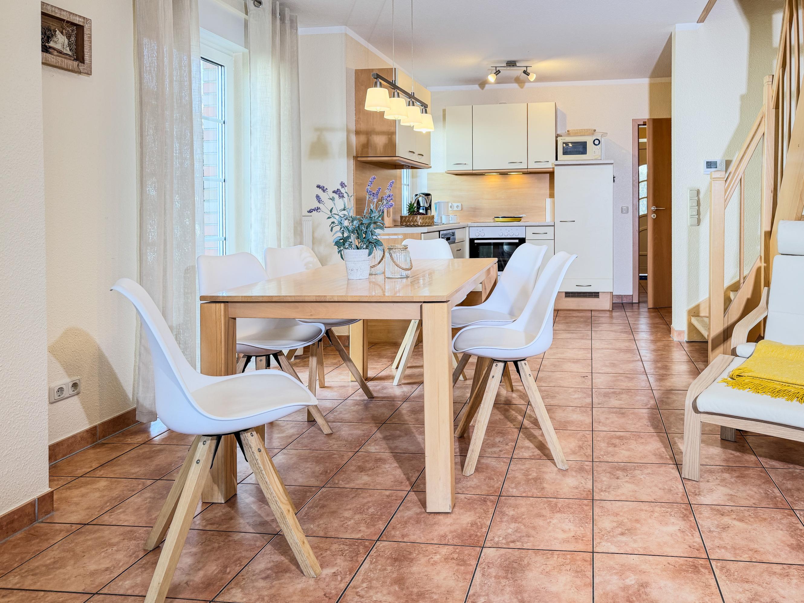 Das Reethus Natalie empfängt Sie mit einer warmen und einladenden Atmosphäre. Der gemütliche Wohnbereich ist das Herz des Hauses und lädt zu entspannten Abenden ein – sei es bei einem guten Buch oder einem gemeinsamen Spieleabend. Die moderne Küche ist vollständig ausgestattet, sodass Sie mühelos köstliche Mahlzeiten für Ihre Liebsten zubereiten können.