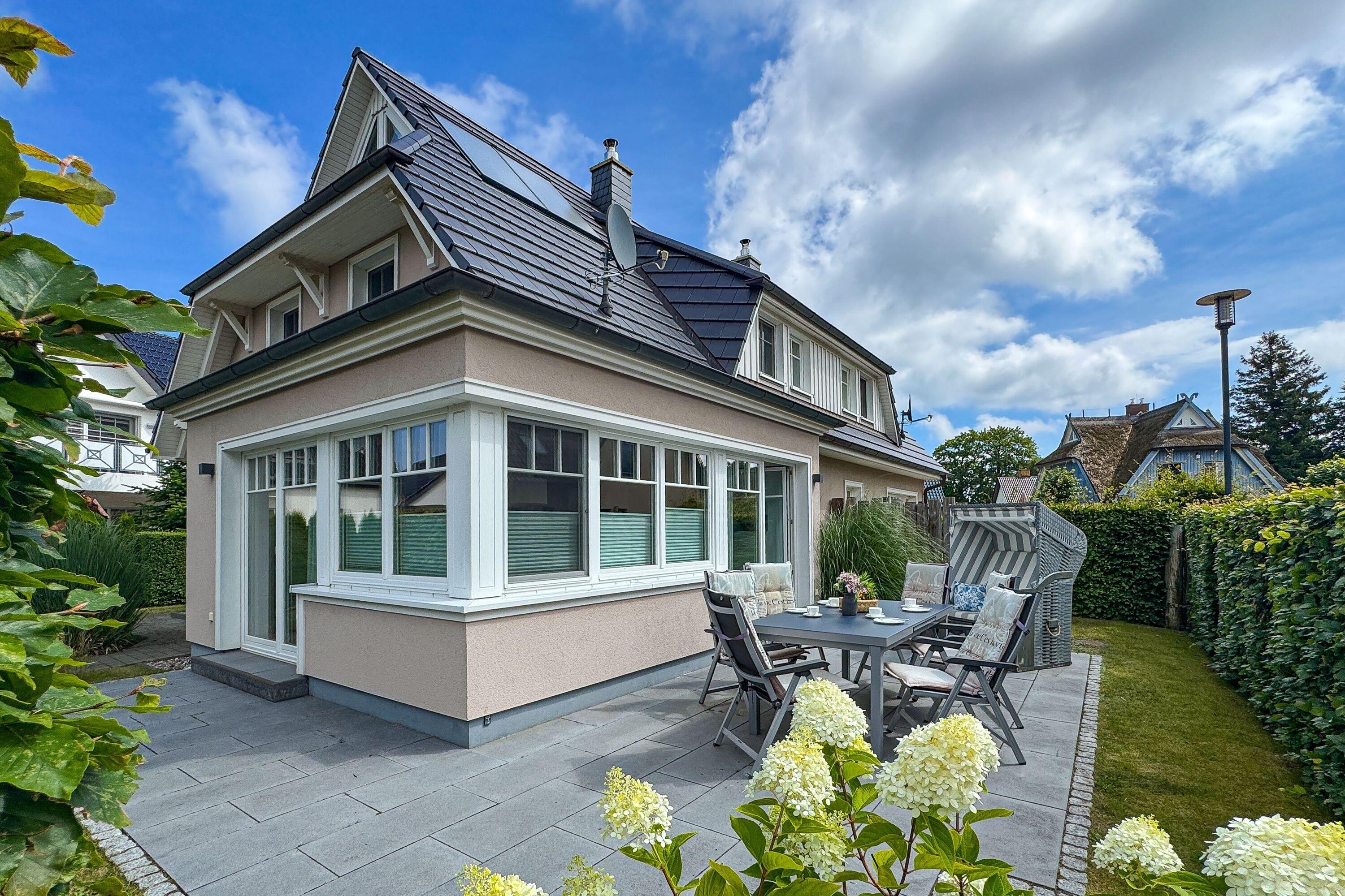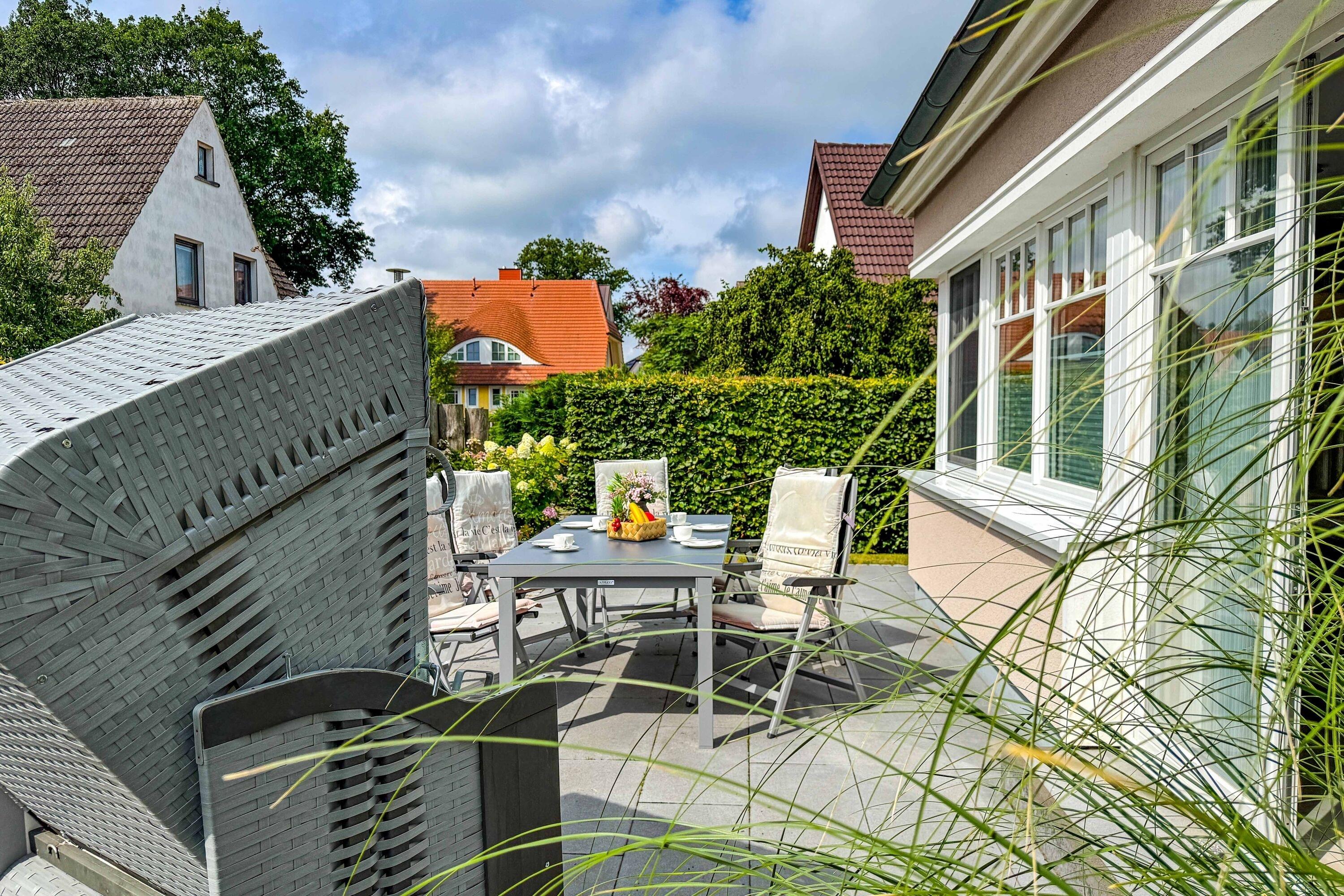Die Terrasse mit eigenem Strandkorb bietet sonnige Ruheplätze, während der Garten Raum für Entspannung und gemeinsame Momente schafft.