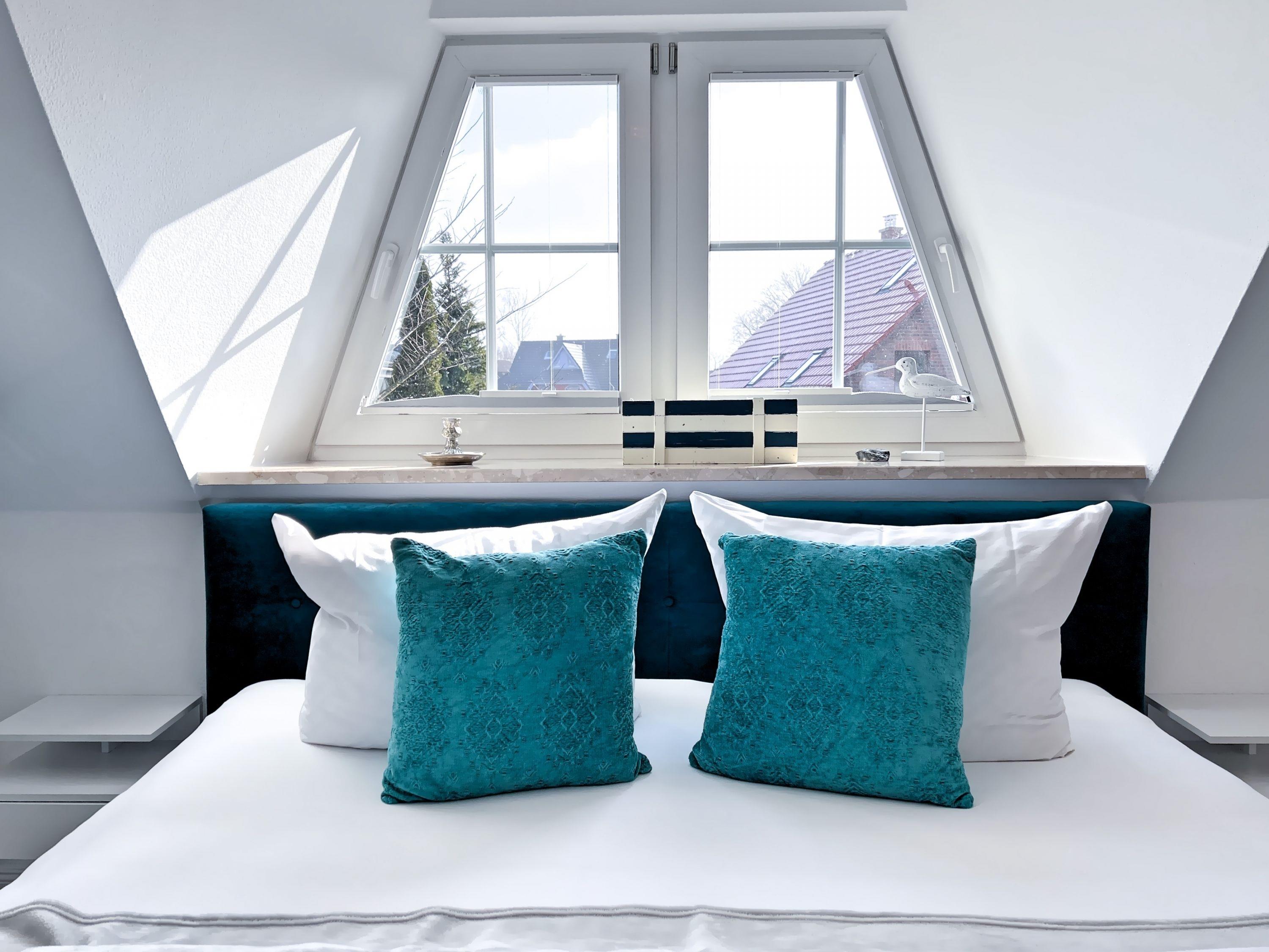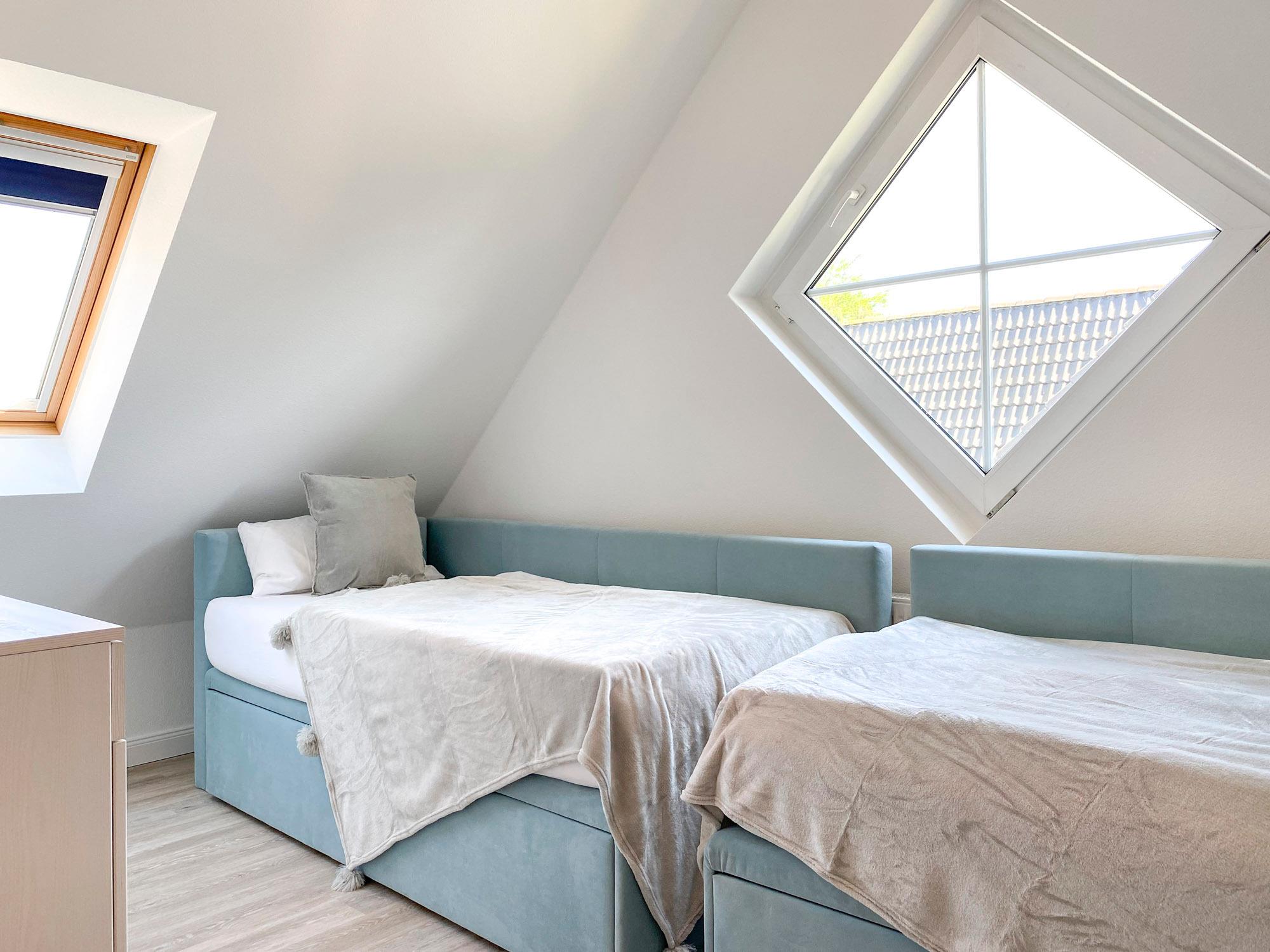 Drei Schlafzimmer: zwei mit komfortablen Boxspringbetten, eines im Dachgeschoss – ideal für Kinder