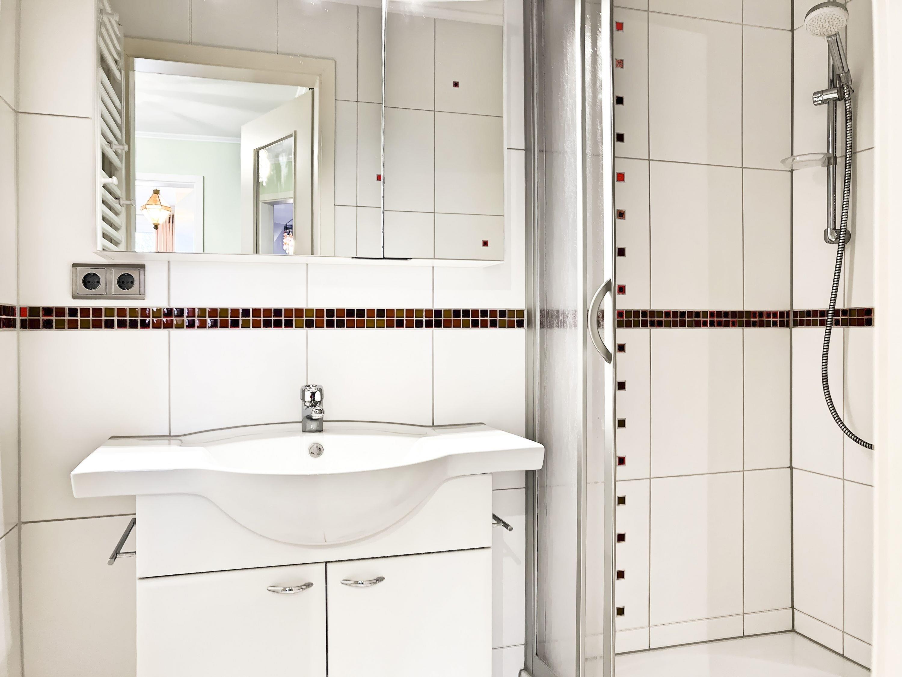 Modernes Badezimmer mit erfrischender Dusche und beleuchtetem Spiegel
