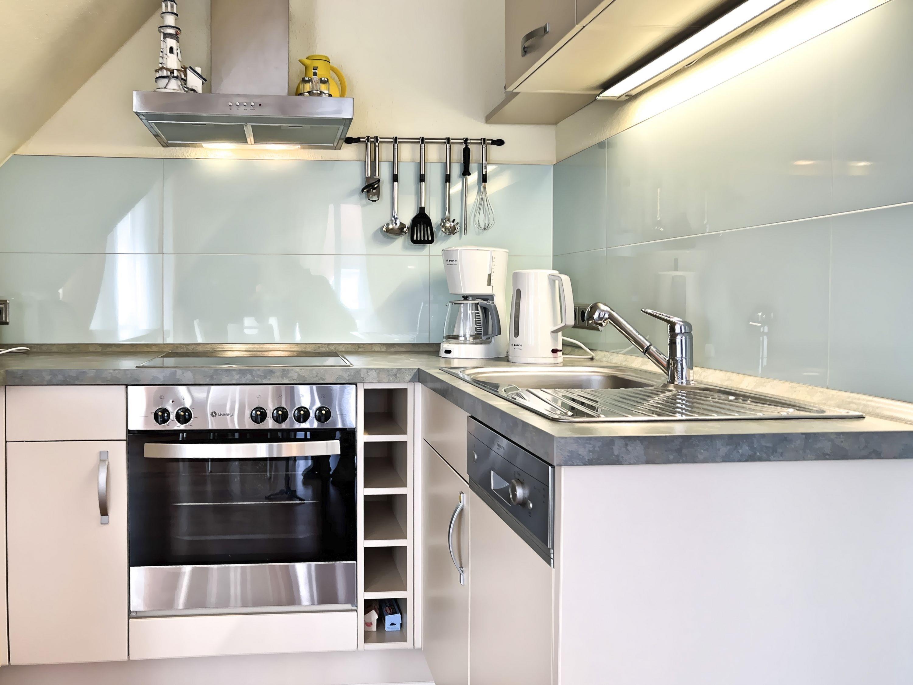 Voll ausgestattete Küche mit Kühlschrank, Ceranfeld, Mikrowelle, Kaffeemaschine, Toaster und Spülmaschine