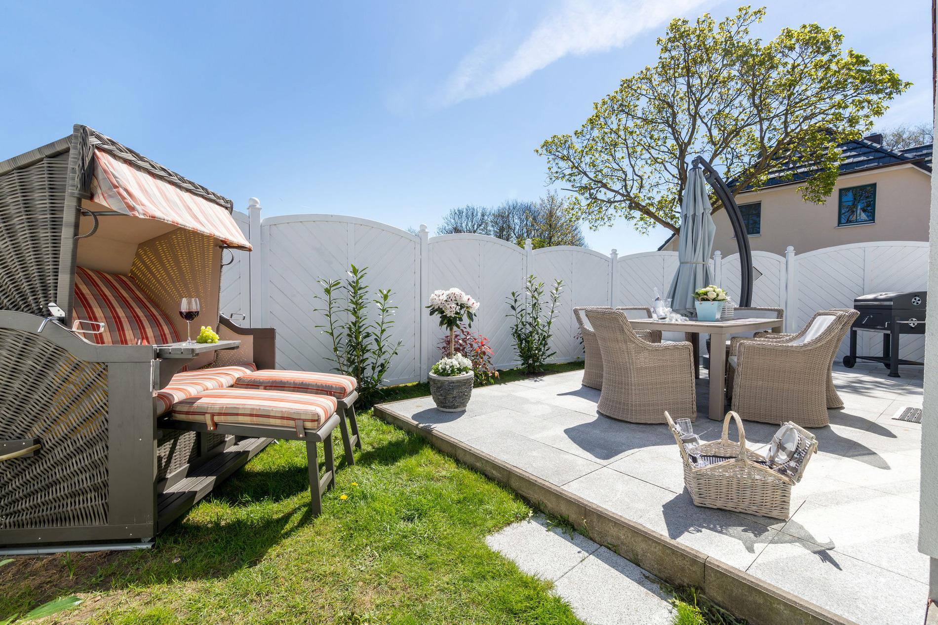 Der eingezäunte Garten ist ein kleines Paradies für Familien. Die jüngsten Gäste dürfen sich auf ein Smoby-Kinderspielhaus und eine Spielküche freuen. Selbstverständlich stellen wir Ihnen Kinderbett und Hochstuhl kostenlos zur Verfügung. Während die Kleinen spielen, können die Großen auf der Terrasse entspannen und den Tag in aller Ruhe ausklingen lassen.