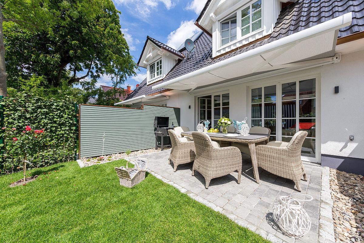 Terrasse [&] Garten: Sonnenterrasse mit hochwertigen Gartenmöbeln, elektrischer Markise, Außengrill (Propangas) und eingezäuntem Garten