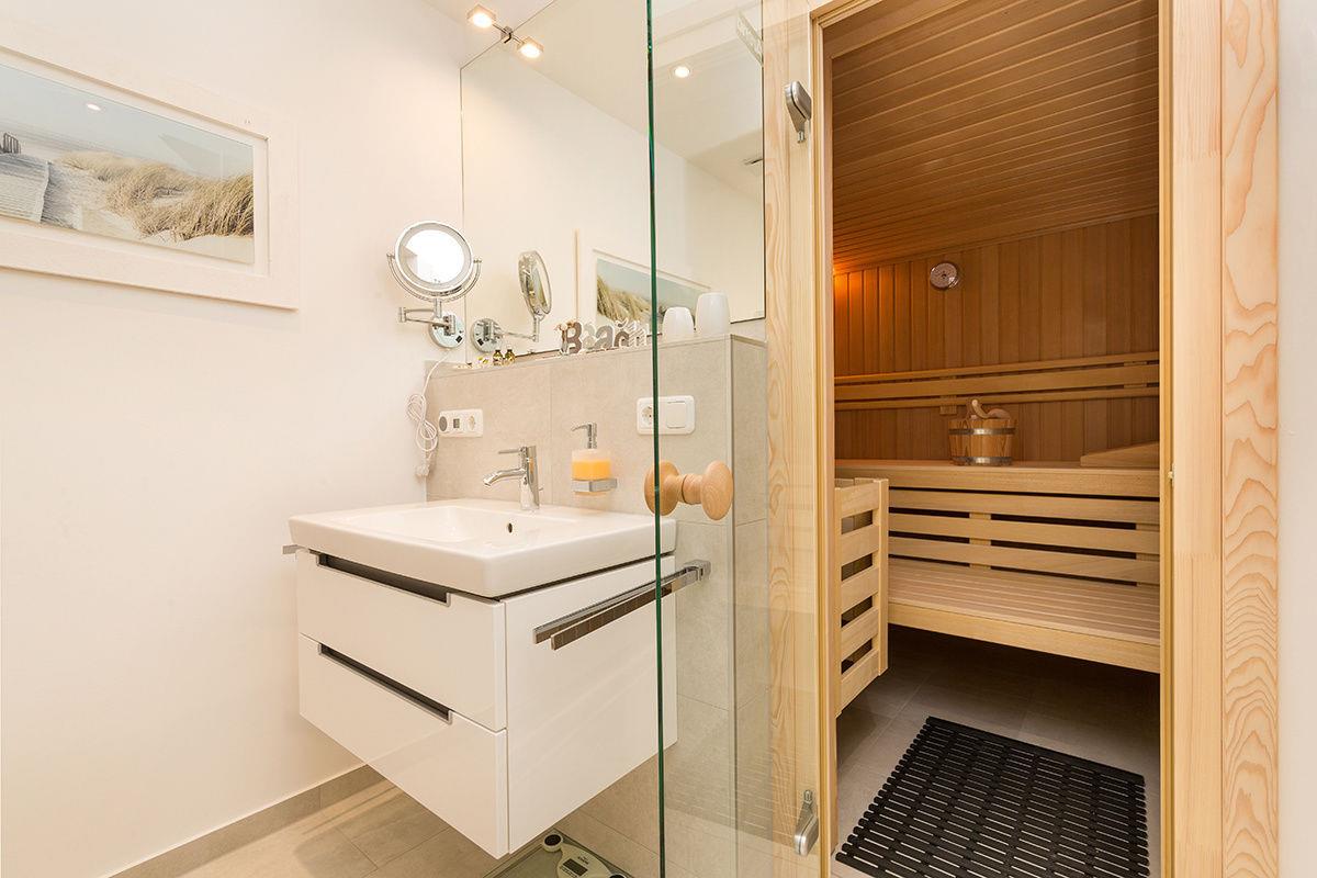 Badezimmer: Zwei moderne Bäder – eines mit Dusche, das andere mit ebenerdiger Regendusche und großzügiger Sauna