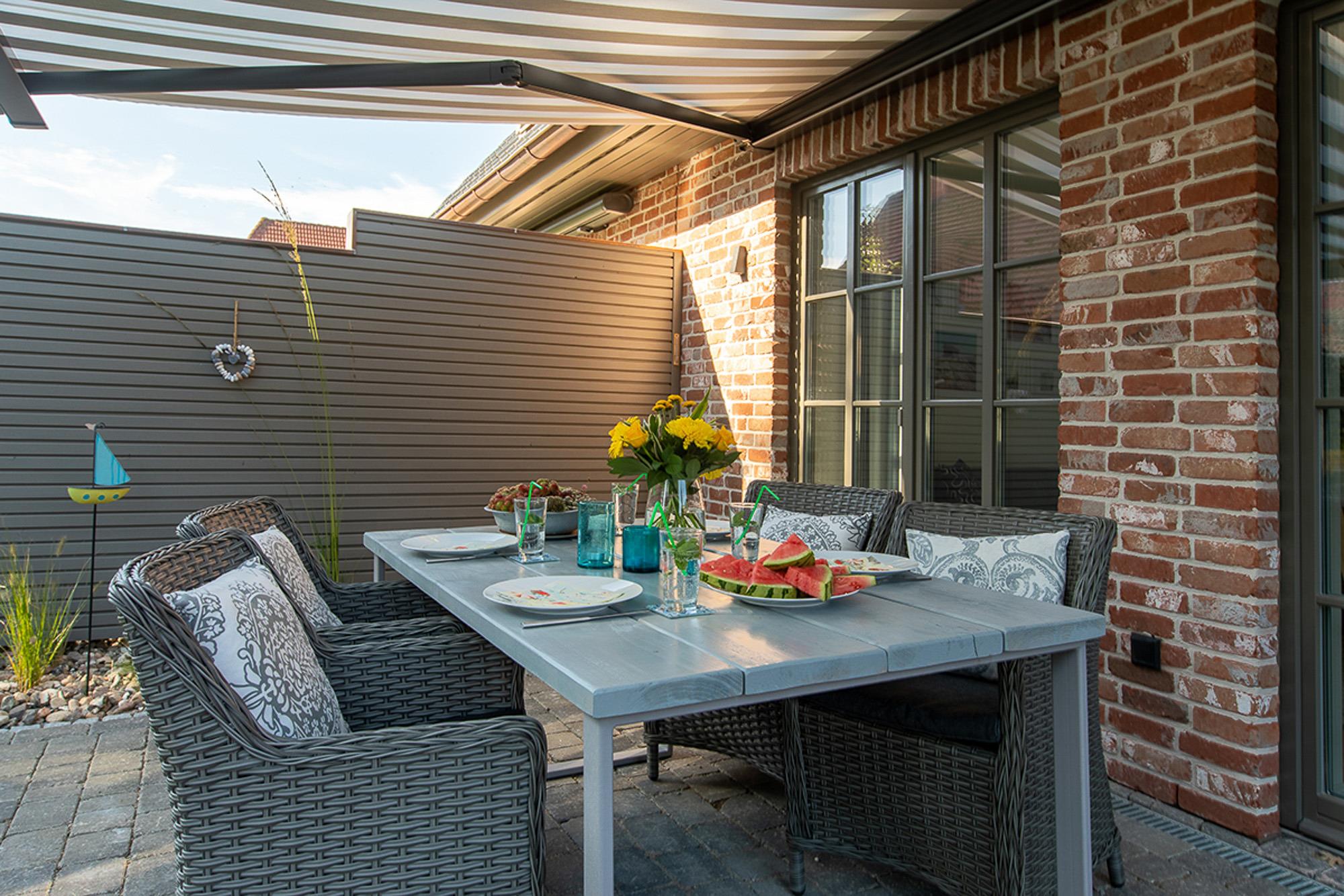 Große Terrasse mit elektrischer Markise und Gasgrill