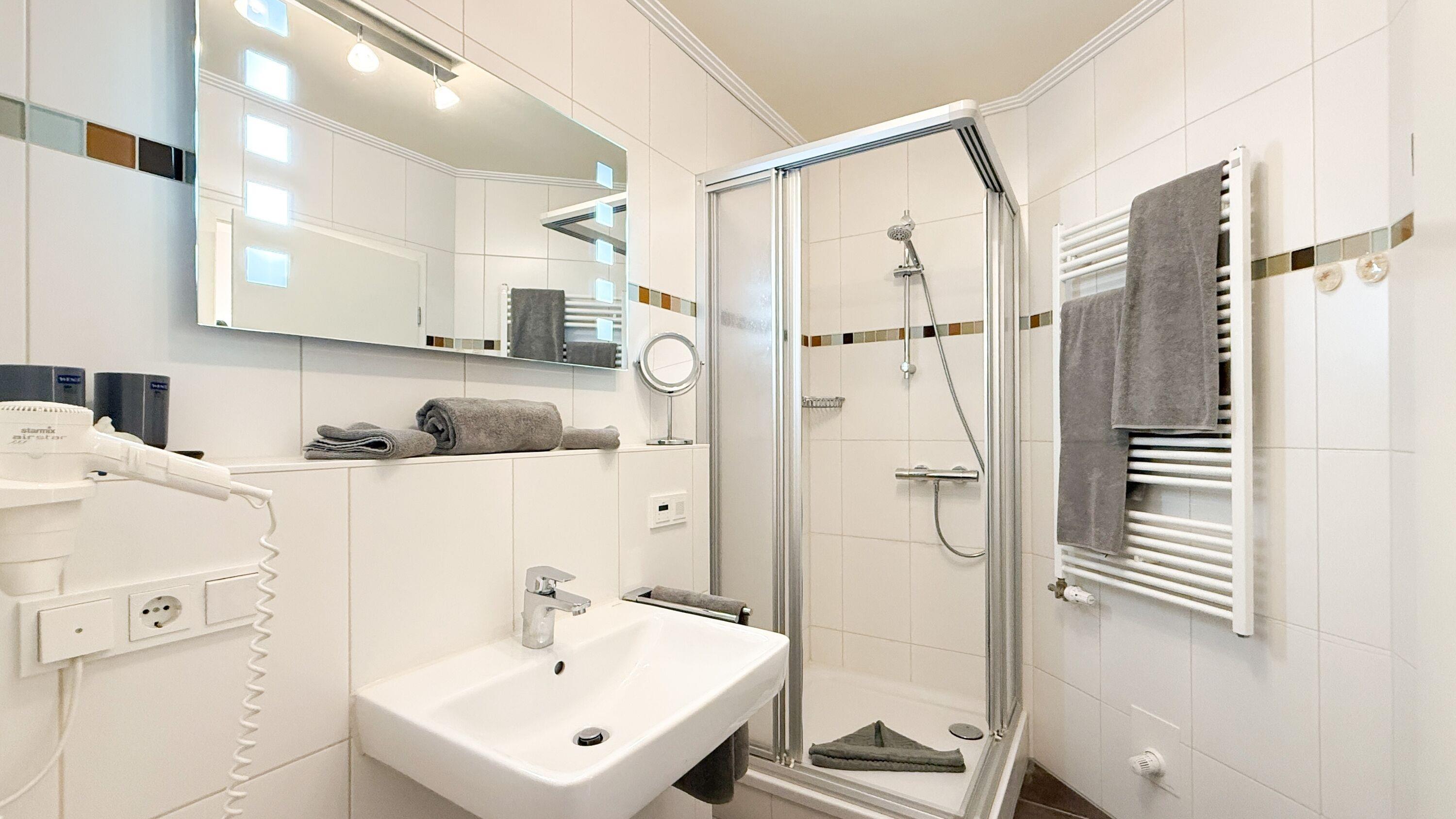 Ein Badezimmer mit Dusche, Waschbecken, WC und Fön