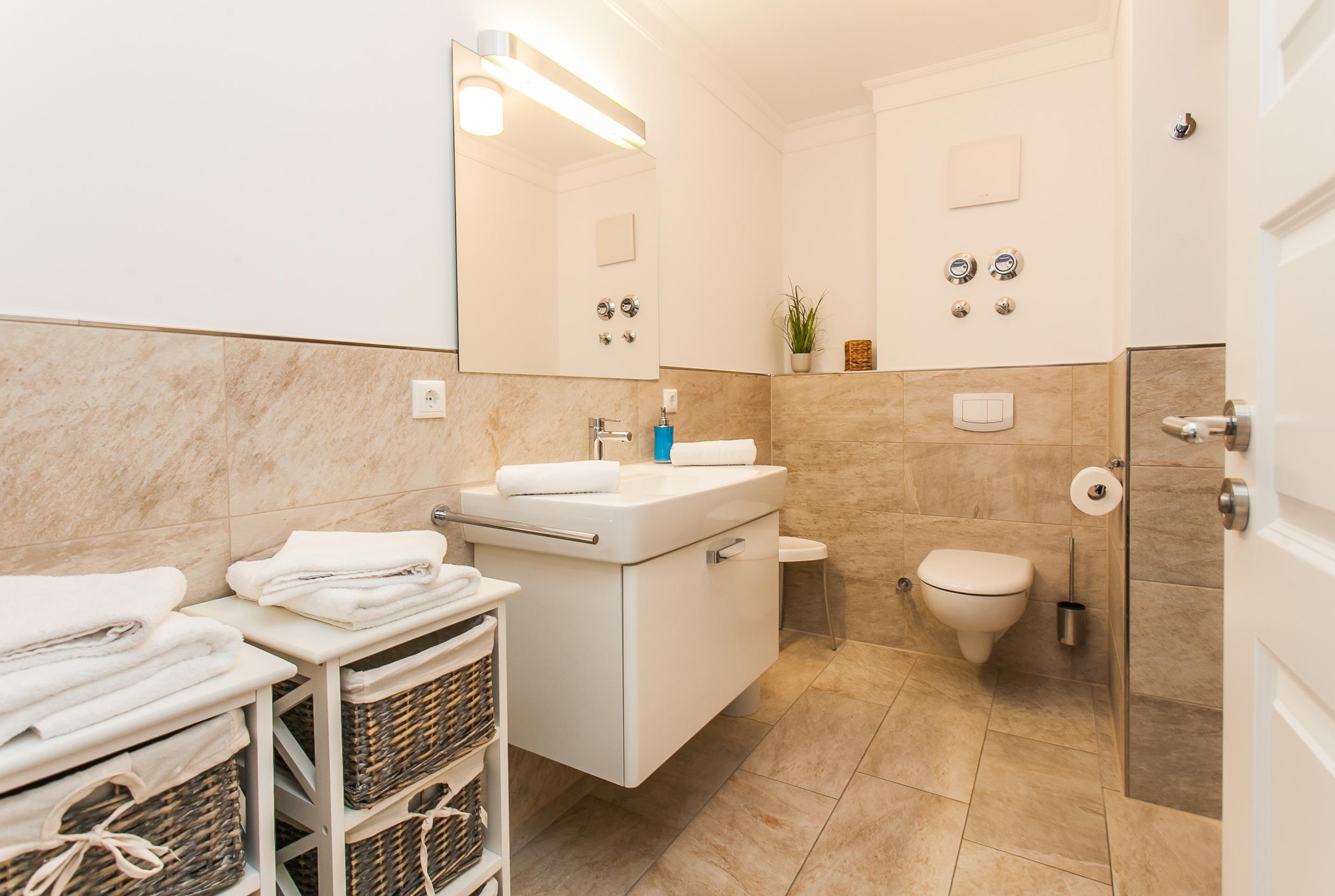 Die Ferienwohnung ist ausgestattet mit einem Wohnraum mit Schlafsofa (ca.1,20m x 2,00 m), einer komplett eingerichteten Küchenzeile inkl. Nespressomaschine. Einem Schlafzimmer mit Boxspringbett (1,60 m x 2,00 m) und einem Badezimmer mit ebenerdiger Dusche (Regendusche und Handbrause) und WC.