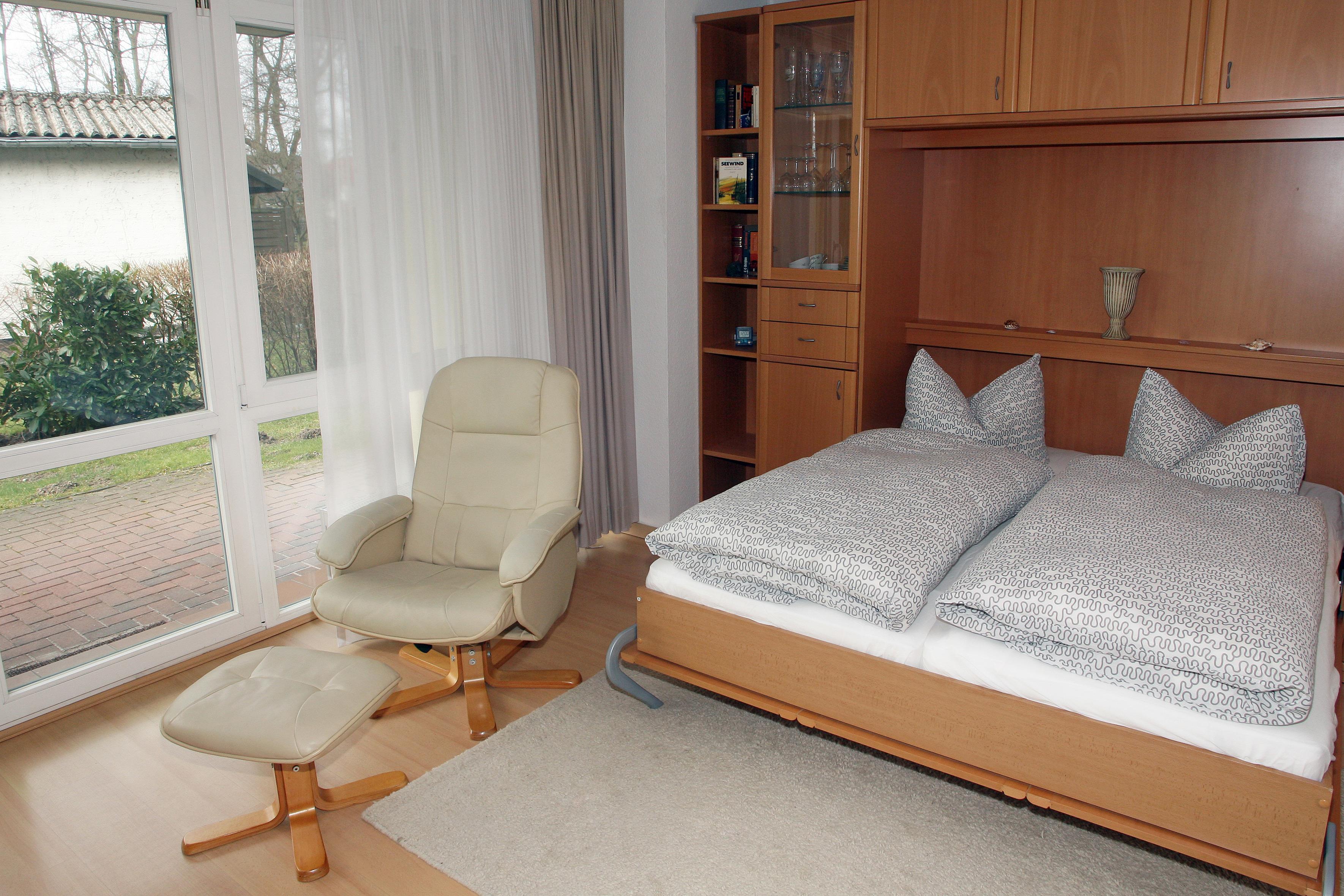Es ist ausgestattet mit einem Doppelbett, einem Sofa, SAT - TV, einer Küchenzeile und einem Bad mit Badewanne und WC.