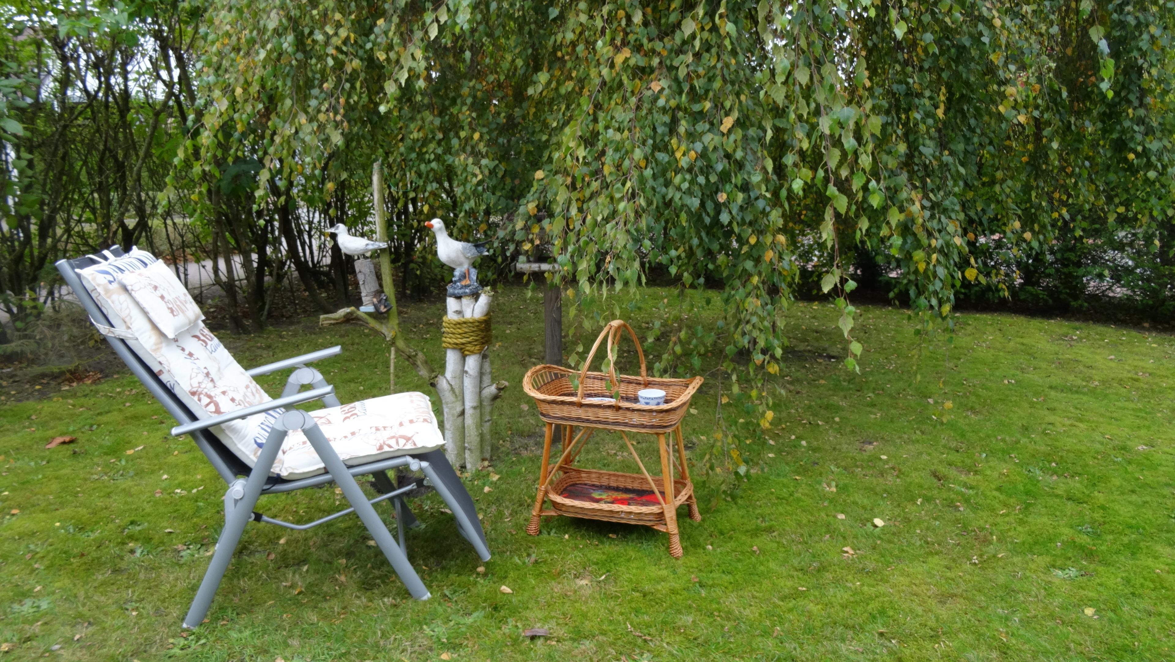 Die Wohnung liegt im EG mit Zugang zu einem kleinen durch Hecken abgeschirmten Garten. Auf der 12qm großen Terrasse zur Südseite befinden sich Gartenmöbel, Sonnenliege sowie ein Strandkob. Zur Beschattung gibt es einen großen Sonnenschirm mit Leier.