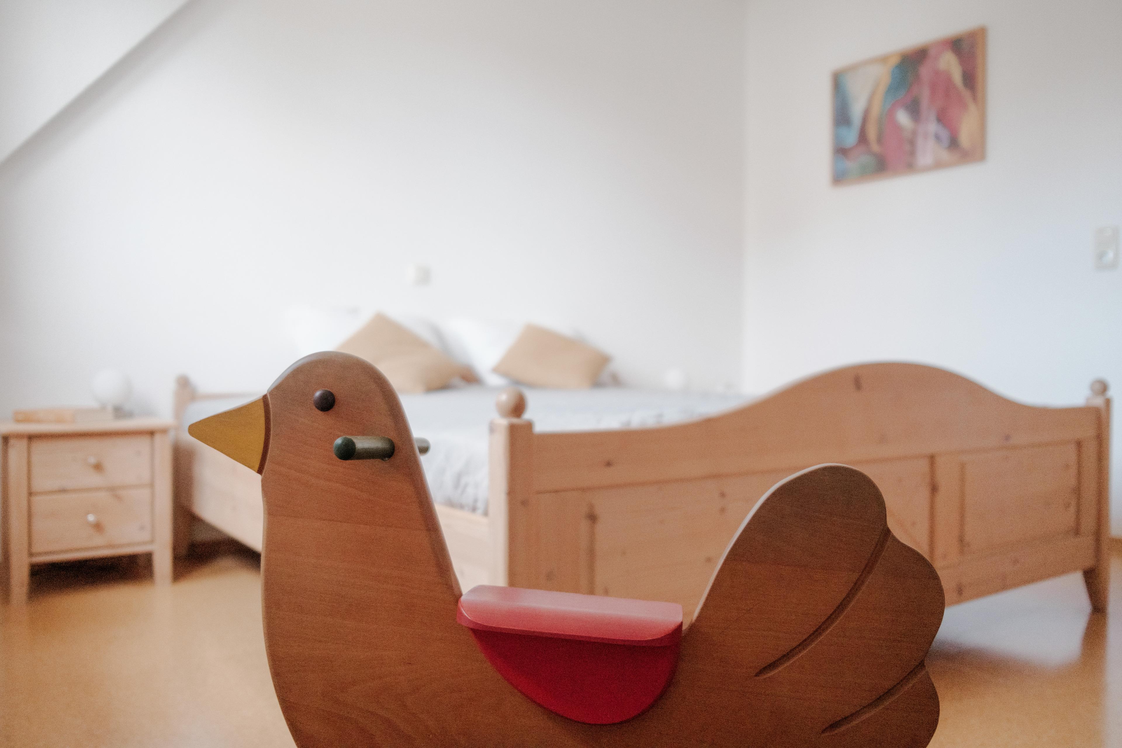 Waschmaschine. Zur weiteren Einrichtung gehören ein Sat-TV und ein Radio. Ein Kinderstuhl und ein Kinderreisebett sind vorhanden. Die Wohnung liegt im 1. Obergeschoß und besitzt einen Balkon mit Gartenmöbeln.