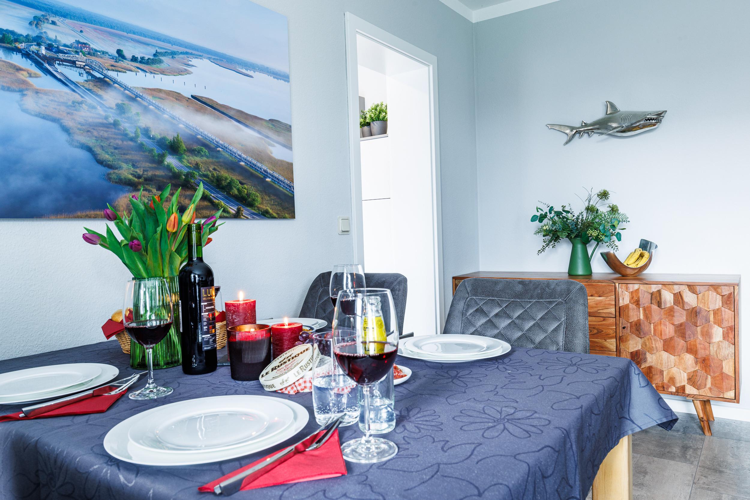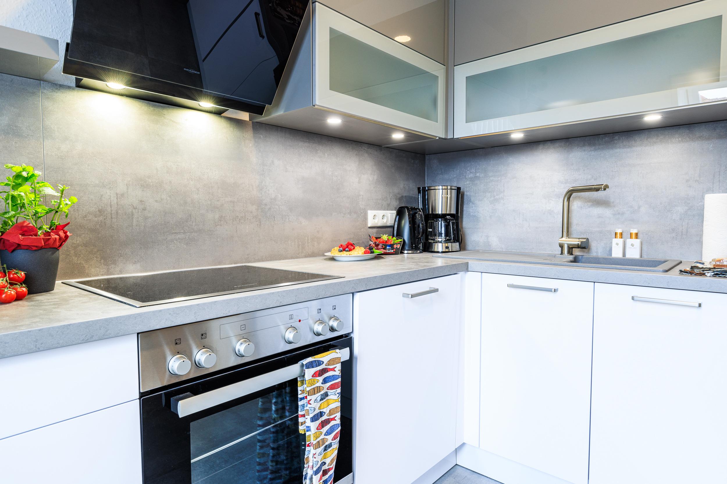 Die Wohnung ist ausgestattet mit zwei geschmackvoll eingerichteten Schlafräumen, die jeweils mit einem komfortablen Boxspringbett ausgestattet sind. Der einladende Wohnbereich verfügt über ein gemütliches Ecksofa, das zum Entspannen einlädt. Die komplett eingerichtete Küche lässt keine Wünsche offen: Hier finden Sie einen Herd mit Cerankochfeld, einen Backofen, eine Geschirrspülmaschine, einen Kühlschrank sowie Toaster und Kaffeemaschine – perfekt für die Zubereitung von köstlichen Mahlzeiten.